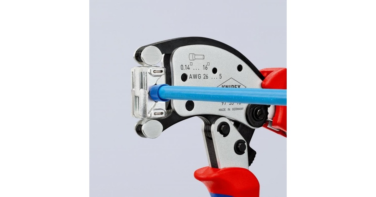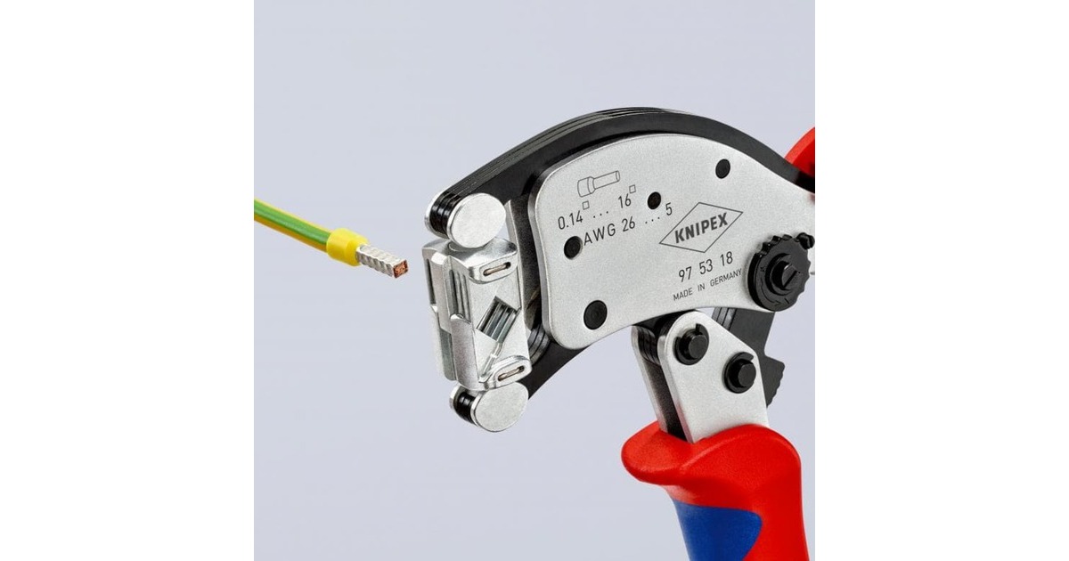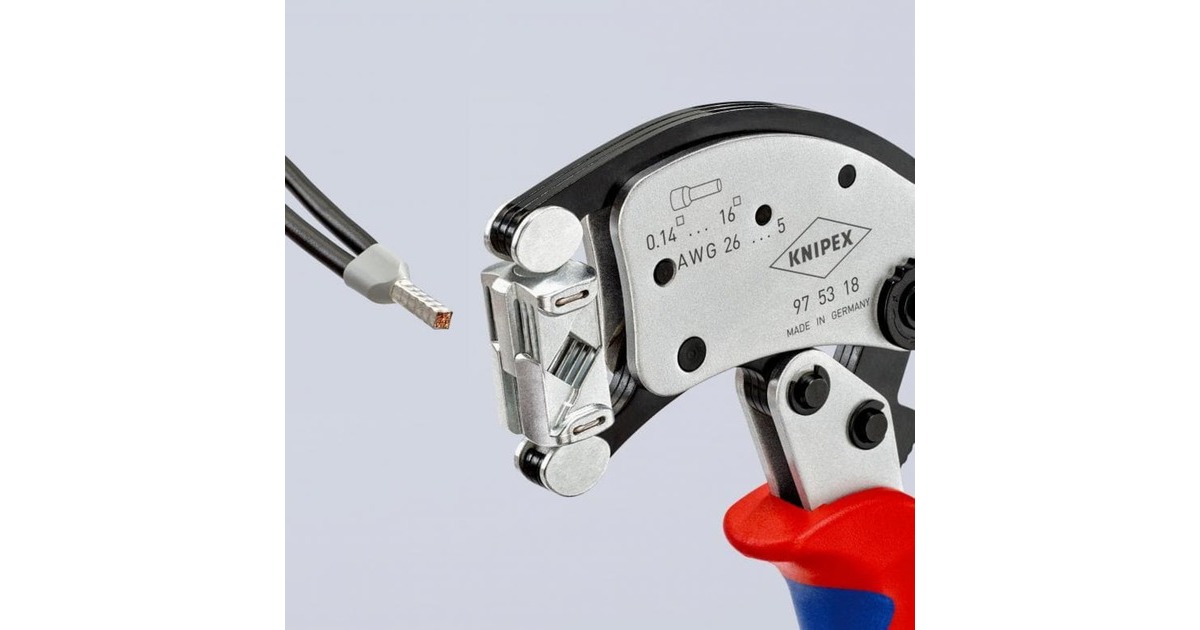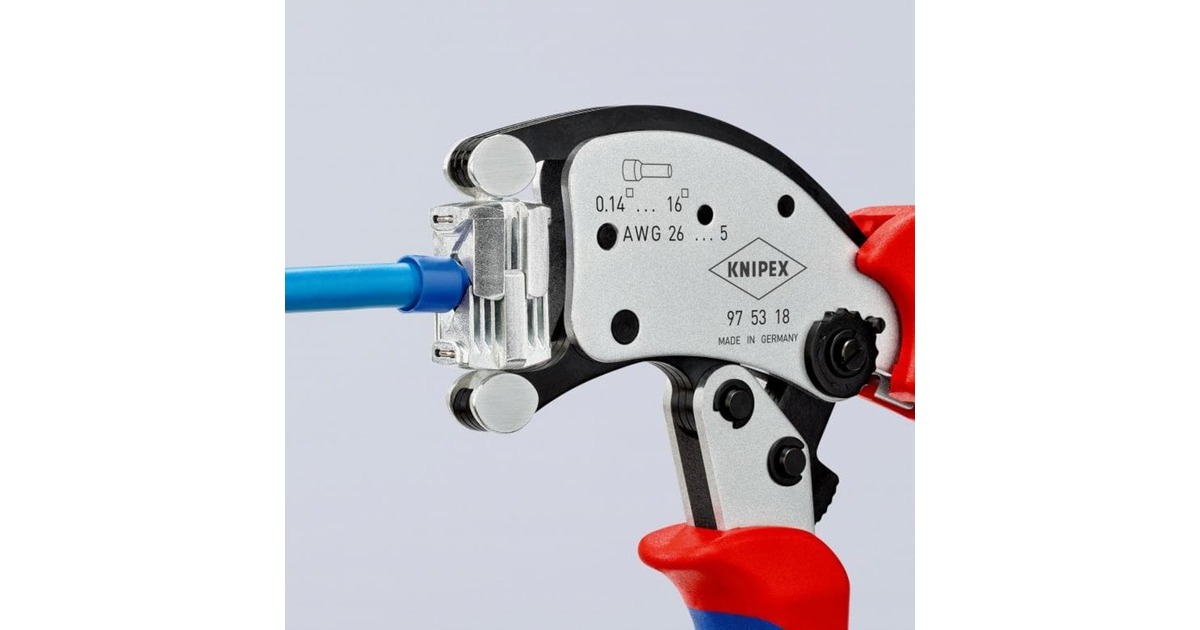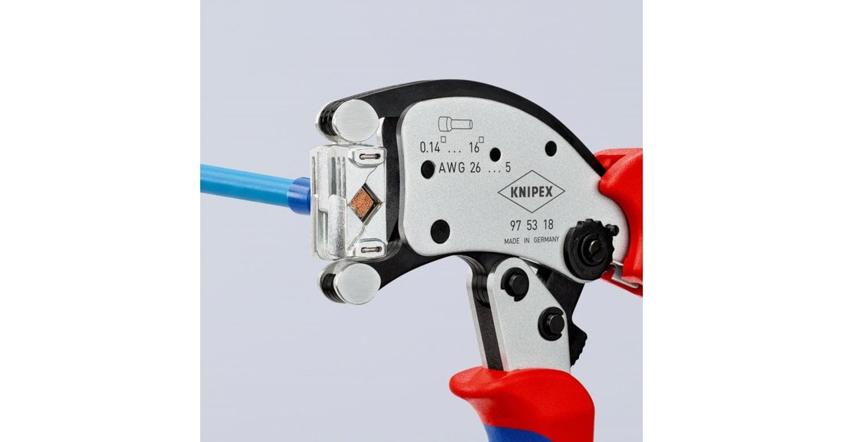 Die selbsteinstellende Crimpzange Twistor 16 von KNIPEX eignet sich zum Verpressen von Aderendhülsen von 0,14 bis 16mm² und von Twin-Aderendhülsen bis 2x 6mm². Die gleichbleibend hohe Crimpqualität wird durch eine Zwangssperre (entriegelbar) und werkseitig präzise eingestellten Crimpdruck gewährleistet. Zusätzlich überzeugt sie mit hohem Bedienungskomfort dank der Kraftverstärkung durch Kniehebel für ermüdungsarmes Arbeiten, die handliche Bauform und geringes Gewicht. Die Crimpzange Twistor 16 bietet große Vorteile für den Anwender: Automatische Selbsteinstellung auf die verwendete Ader-Endhülse entlastet den Fachmann und bietet sicheres, zuverlässiges und schnelles Vercrimpen. Der Crimpkopf mit quadratischem Crimpprofil ist um 360° frei drehbar und bietet 8 Rastpositionen. Die Verbinder können aus nahezu jeder Position in den drehbaren Crimpkopf eingeführt werden, und überlange Aderendhülsen können einfach nachgeschoben werden.Art.-Nr.: 1822631