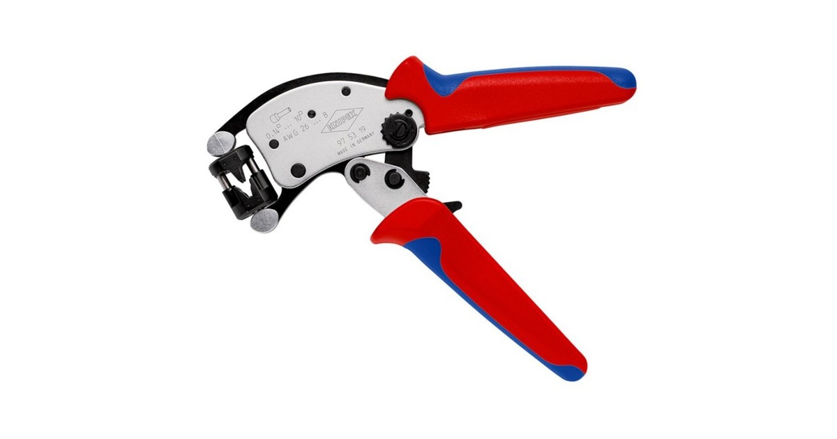 Beidseitig zugängliche Crimpöffnung, Handkraft durch Kniehebelmechanik verstärkt |