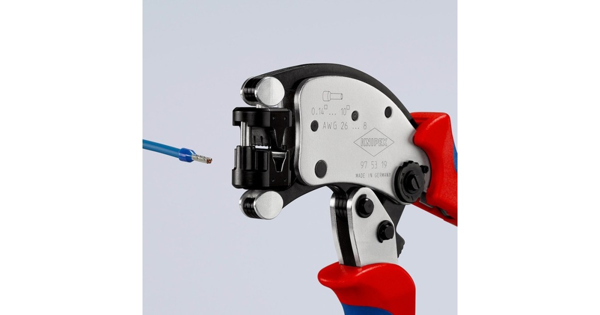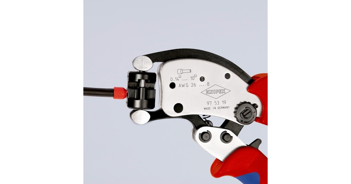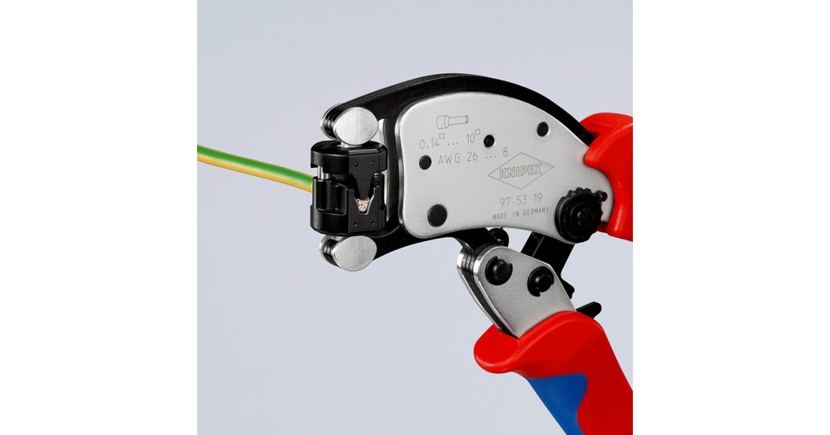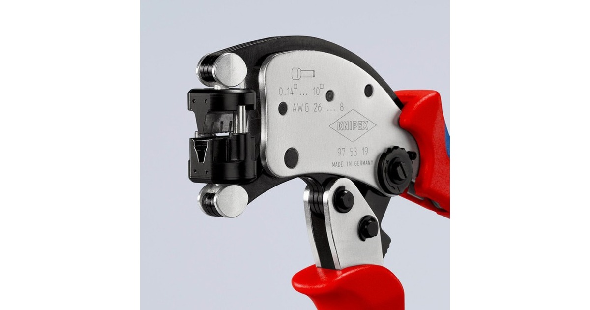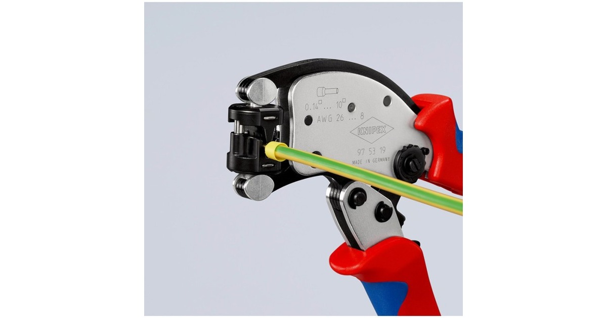 Die selbsteinstellende Crimpzange Twistor T von KNIPEX eignet sich zum Verpressen von Aderendhülsen von 0,14 bis 10mm² und von Twin-Aderendhülsen bis 2x 6mm². Die gleichbleibend hohe Crimpqualität wird durch eine Zwangssperre (entriegelbar) und werkseitig präzise eingestellten Crimpdruck gewährleistet. Zusätzlich überzeugt sie mit hohem Bedienungskomfort dank der Kraftverstärkung durch Kniehebel für ermüdungsarmes Arbeiten, die handliche Bauform und geringes Gewicht. Die Crimpzange Twistor T bietet große Vorteile für den Anwender: Automatische Selbsteinstellung auf die verwendete Ader-Endhülse entlastet den Fachmann und bietet sicheres, zuverlässiges und schnelles Vercrimpen. Der Crimpkopf mit quadratischem Crimpprofil ist um 360° frei drehbar und bietet 8 Rastpositionen. Die Verbinder können aus nahezu jeder Position in den drehbaren Crimpkopf eingeführt werden, und überlange Aderendhülsen können einfach nachgeschoben werden.Art.-Nr.: 1844665