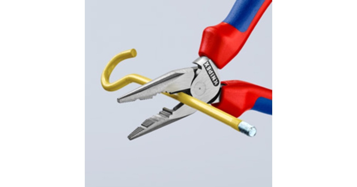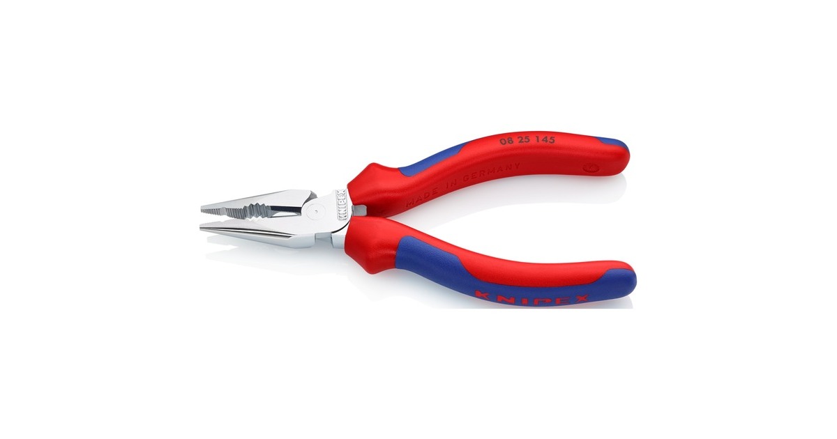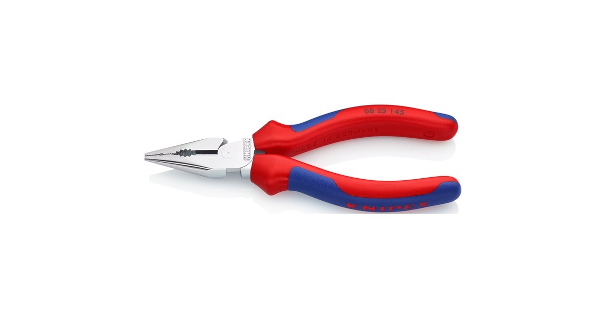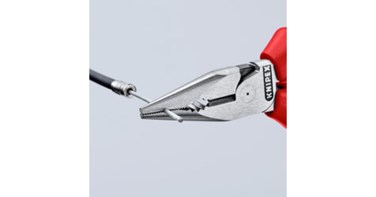 Die Spitz-Kombizange 0825145 von KNIPEX ist besonders handlich, sie eignet sich ideal zum Arbeiten in schwer zugänglichen Arbeitsbereichen dank der schlanken Kopfform mit spitz zulaufenden Backen (sehr verdrehsicher). Zum sicheren Greifen flacher Teile ist die Greiffläche einseitig konvex geformt. Die gefräste Nut im Greifbereich ermöglicht das sichere Halten und Ziehen kleiner Werkstücke wie Nägel, Stifte und Bolzen. Das hochübersetzte Kraftgelenk erleichtert das Schneiden, und die stabilen, mehrstufig ölgehärteten Spitzen überzeugen mit langer Haltbarkeit. Die Spitz-Kombizange 0825145 ist ein zuverlässiger und vielseitiger Helfer für unterwegs, mit Seitenschneider für weichen, mittelharten und harten Draht.Art.-Nr.: 1331944