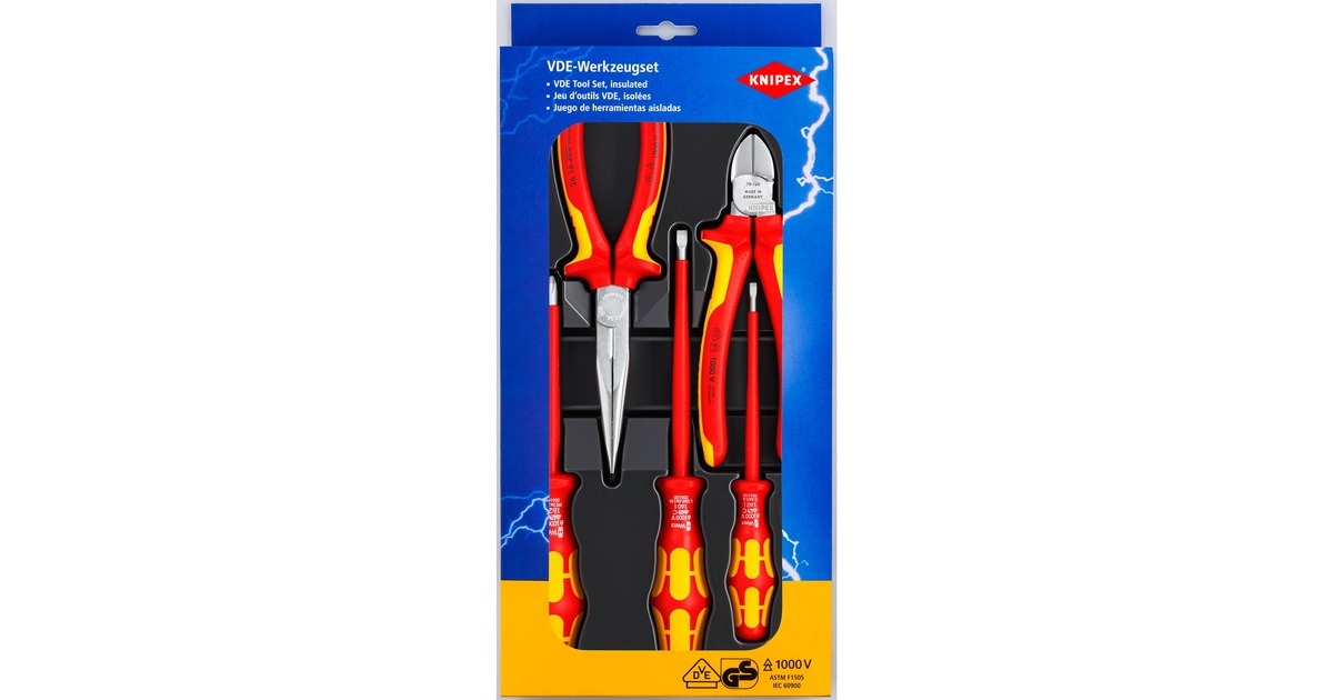 Der Knipex VDE-Werkzeugsatz 002013 enthält fünf VDE-geprüfte Werkzeuge, die Zangen sind verchromt, die Griffe mit Mehrkomponenten-Hüllen versehen. Die Werkzeuge werden im Kunststoff-Tiefziehteil mit transparentem Deckel geliefert. Der VDE-Werkzeugsatz 002013 enthält eine Knipex Flachrundzange mit Schneide, (Storchschnabelzange) 200mm, einen Knipex Seitenschneider 160mm, einen Wera Schraubendreher für Schlitzschrauben 0,6 x 3,5 x 100mm, einen Wera Schraubendreher für Schlitzschrauben 1,0 x 5,5 x 125mm und einen Wera Schraubendreher Kreuzschlitz PH2 x 100mm.Art.-Nr.: 1441493