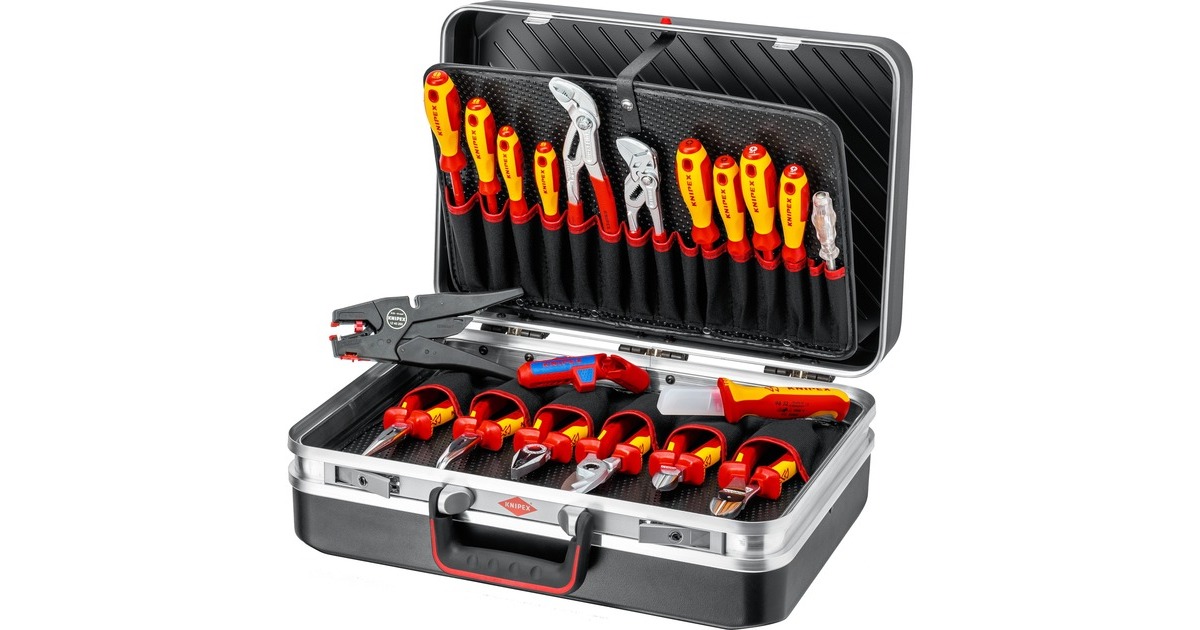 Der Werkzeugkoffer "Vision24" Elektro 00 21 20 von Knipex ist mit 20 Markenwerkzeugen, teilweise VDE-geprüft nach DIN EN 60900, bestückt. Er enthält Abisolier-Werkzeuge, Zangen und Schraubendreher. Knipex-Werkzeuge, die das Sonderzeichen 1000 V tragen, sind für Arbeiten bis 1.000 Volt AC zugelassen. Damit sichergestellt werden kann, dass die Spezialisolierung tatsächlich den Spannungen standhält, wird jedes Werkzeug, bevor es das Haus Knipex verlässt, einer Durchschlagprüfung mit 10.000 V AC unterzogen. Der Werkzeugkoffer bietet flexible Gestaltungsmöglichkeiten durch die individuell unterteilbaren Einsätze in der 60mm tiefen Bodenschale und deren Abdecktafel mit sechs großen Werkzeugtaschen. Die herausnehmbare Werkzeugtafel mit 15 Werkzeugtaschen auf der Bodenseite und sechs Werkzeugtaschen sowie einem Klemmfach (400mm breit) auf der Deckelseite werden per Druckknopf gehalten. Die stabilen Rasterscharniere halten den Deckel trotz des Eigengewichts der Werkzeuge bei Bedarf offen. Der stabile, ergonomische Tragegriff rastet im 90° Winkel ein, und zwei abschließbare Stahl-Kippschlösser schützen den Kofferinhalt vor Diebstahl. Der strapazierfähige Koffer mit umlaufendem Doppel-Aluminiumrahmen ist aus ABS-Material gefertigt, die Abdeck- und Werkzeugtafeln aus schmutzabweisenden PP-Hohlkammerplatten.Art.-Nr.: 1863263