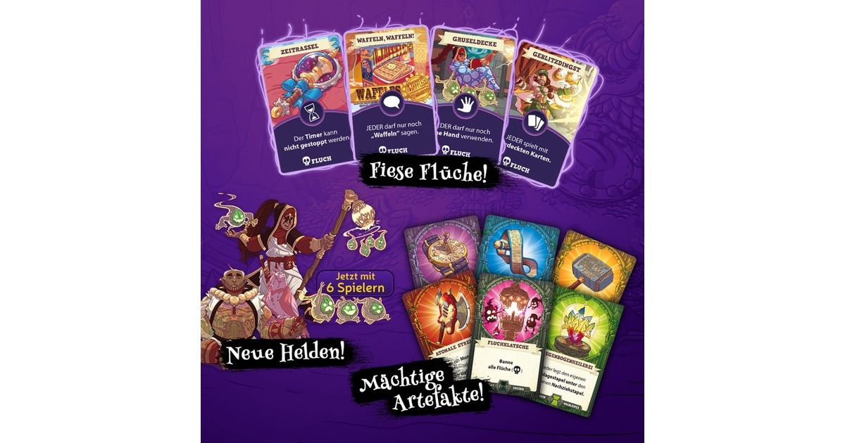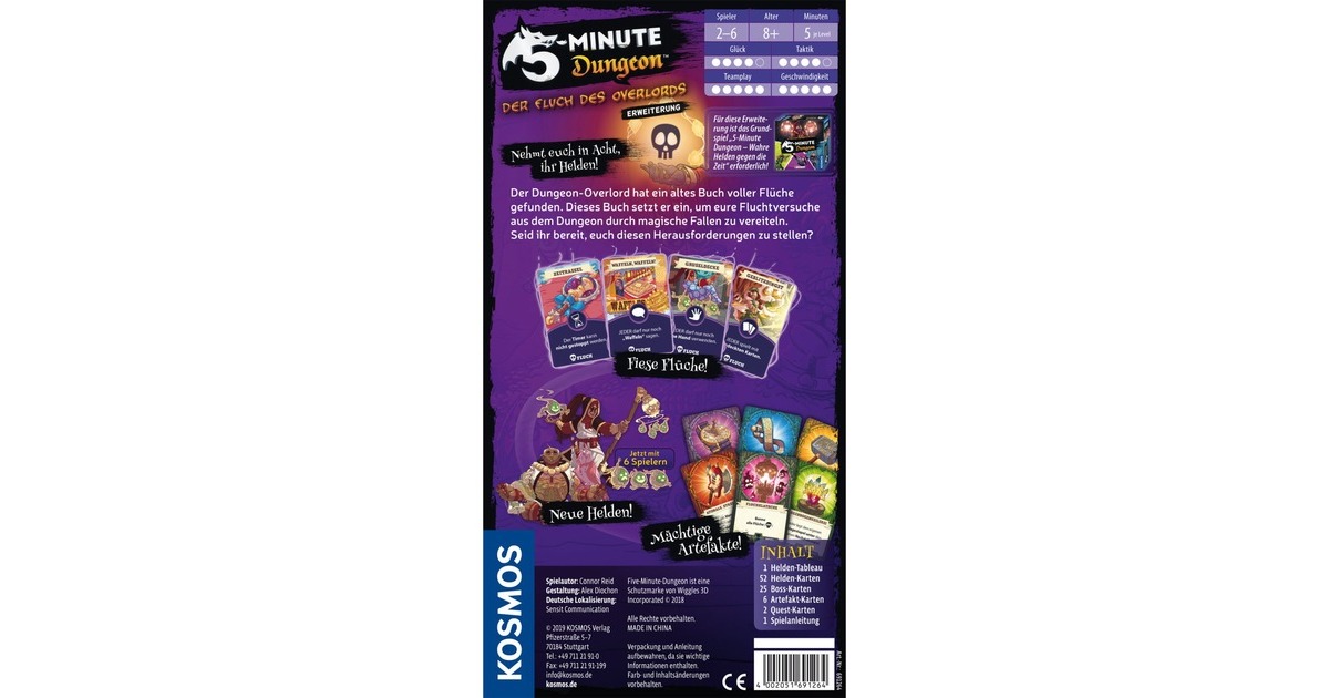 In dieser Erweiterung für 5-Minute Dungeon hat der Overlord mächtig aufgerüstet. Jeder Endgegner hat neue Spielzeuge erhalten mit denen sie den Helden das Leben schwer machen, allen voran die neuen Fluchkarten, die die Helden vor dauerhafte Probleme stellen. Doch auch die Helden haben neue Tricks im Ärmel: mächtige Artefaktkarten unterstützen die Heldengruppe, die dank neuer Verbündeter nun auch zu sechst den Dungeon erobern können. Ein spannendes Realtime-Abenteuer wartet!Art.-Nr.: 1524805