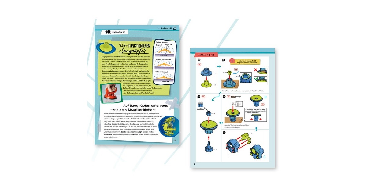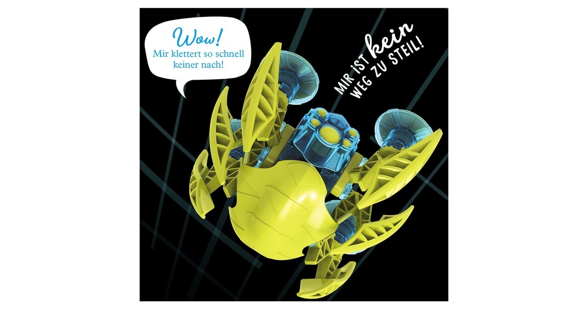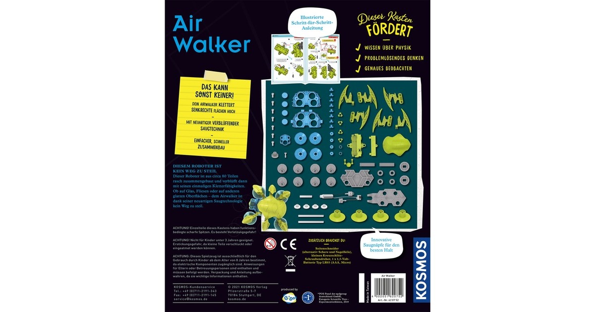 Hoch hinaus! Einfach unglaublich, wie dieser Roboter-Käfer die Fensterscheibe hochklettert! Der Zusammenbau des kleinen, flinken Kletterkünstlers ist für Kinder von 8 bis 12 Jahren einfach umgesetzt: Die etwa 50 Einzelteile zusammenklicken und Batterie einlegen. Mit seinen sechs Beinen und der speziellen Saugnapftechnologie hangelt sich der Air Walker unermüdlich an steilen Scheiben und glatten Spiegeln entlang. Wie das Elektro-Pumpsystem im Inneren des kleinen Roboters funktioniert, erfahren die Kinder in der Anleitung. Zusammenbauen und in Bewegung setzen – mit dem KOSMOS Experimentierkasten macht Robotik Spaß!Art.-Nr.: 1732692