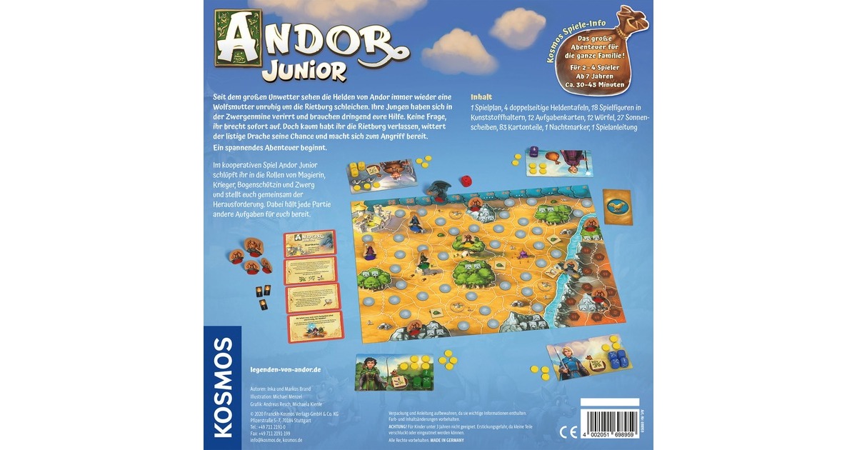 Großer Schreck! Die Wolfsjungen haben sich in den Bergen verirrt und brauchen dringend Hilfe. Keine Frage, dass die Helden von Andor zu ihrer Rettung eilen. Doch kaum haben sie die Rietburg verlassen, wittert der listige Drache seine Chance und macht sich zum Angriff bereit. Werden die Helden es schaffen, ihre Aufgaben zu erfüllen, bevor der Drache die ungeschützte Burg erreicht? Ein spannendes Abenteuer in der Welt von „Die Legenden von Andor“ beginnt! Im kooperativen Brettspiel „Andor Junior“ schlüpfen 2-4 Spieler ab 7 Jahren in die Rollen von Magier, Waldläufer, Krieger und Zwerg und stellen sich gemeinsam einer Reihe von Herausforderungen. Dabei ist keine Partie wie die andere, denn jedes Abenteuer hält andere Aufgaben für die Helden bereit. Mal gilt es, wertvolle Gegenstände zu finden, mal Verbündete zu retten oder sich im Kampf mutig den nahenden Gors entgegenzustellen. Wird es den Helden gelingen, das Land Andor in diesem Gesellschaftsspiel zu beschützen? Fantasy und Abenteuer im kooperativen Brettspiel „Andor Junior“ für die ganze Familie!Art.-Nr.: 1618833