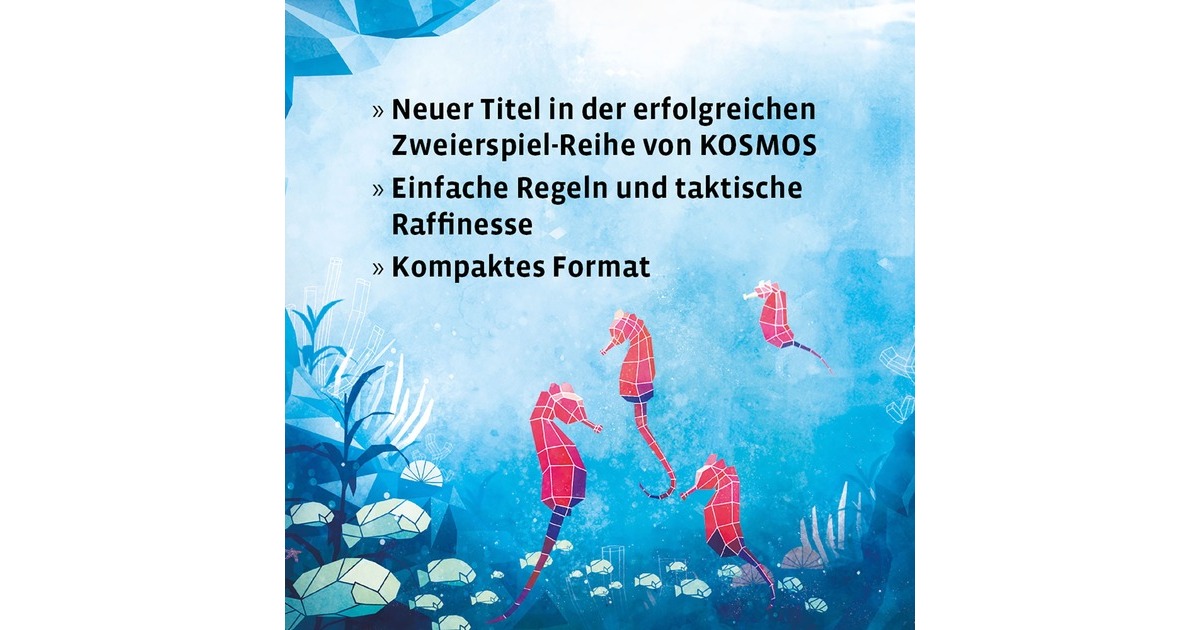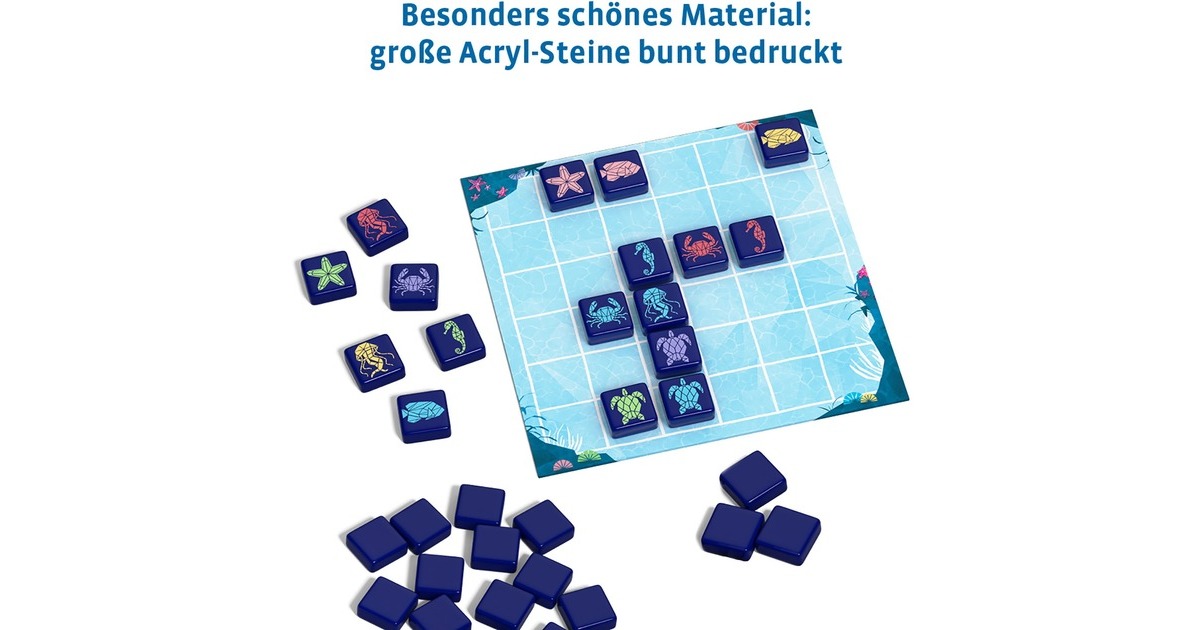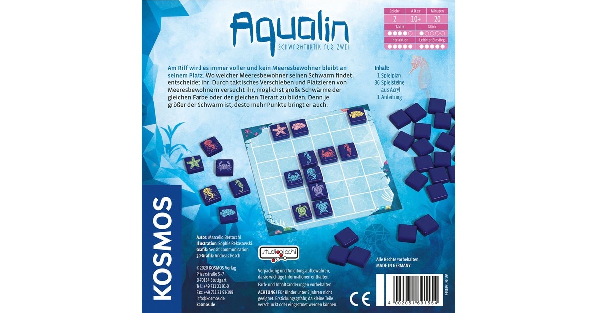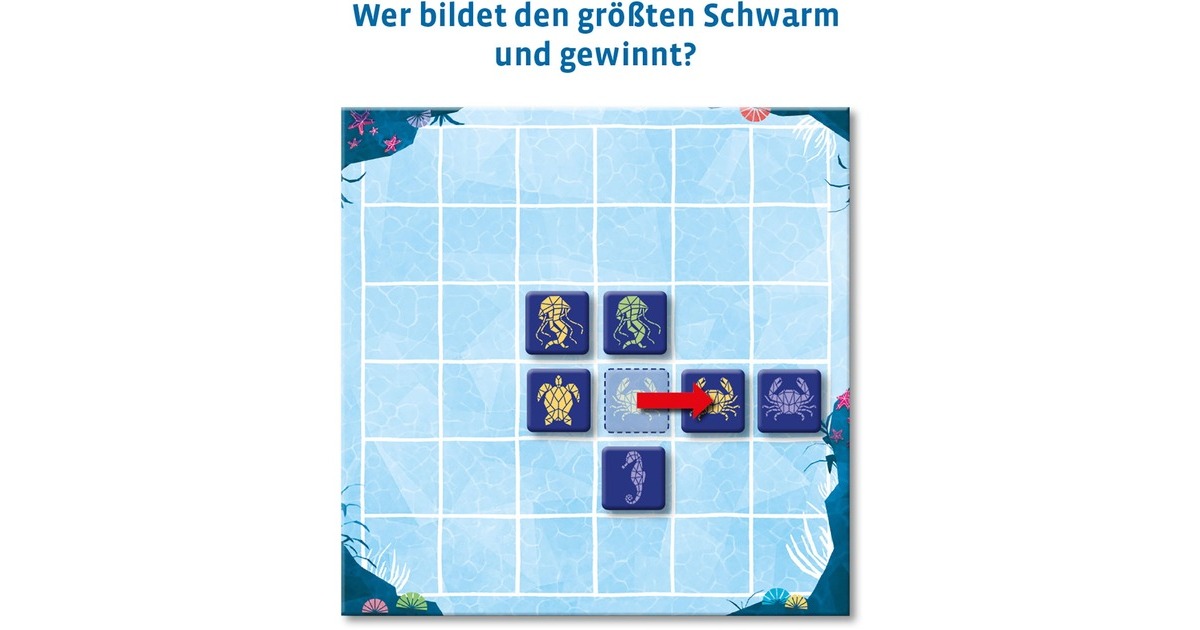 Schildkröte, Seepferdchen, Oktopus: Wer behält in diesem Spiel für 2 Personen den Überblick? Das Getümmel am Riff ist groß und die unterschiedlichen Meerestiere bilden immer wieder aufs Neue einen kunterbunten Schwarm. Sechs Spielsteine wählt der aktive Spieler in jedem Spielzug aus und legt ihn auf ein leeres Feld. Die Spieler ab 10 Jahren ordnen ihre Gruppen mit Meeresbewohnern entweder nach Farbe oder Tierart. Erlaubt ist, vor dem Zug einen Stein zu verschieben und so Schwärme neu zu bilden. Das Strategiespiel gewinnt, wem es in 36 Spielzügen gelingt, die größten Schwärme zu bilden. Eintauchen und ein spannendes Duell mit Tiefgang im Pazifik erleben!Art.-Nr.: 1618837
