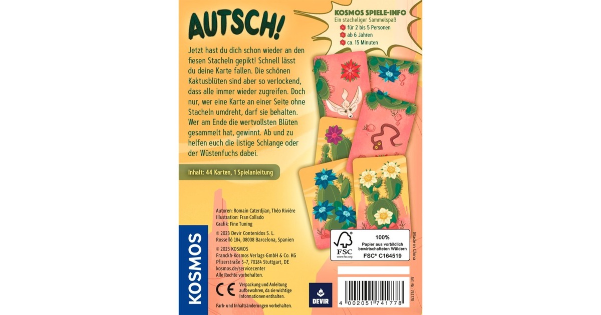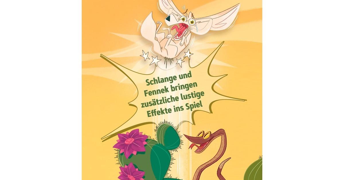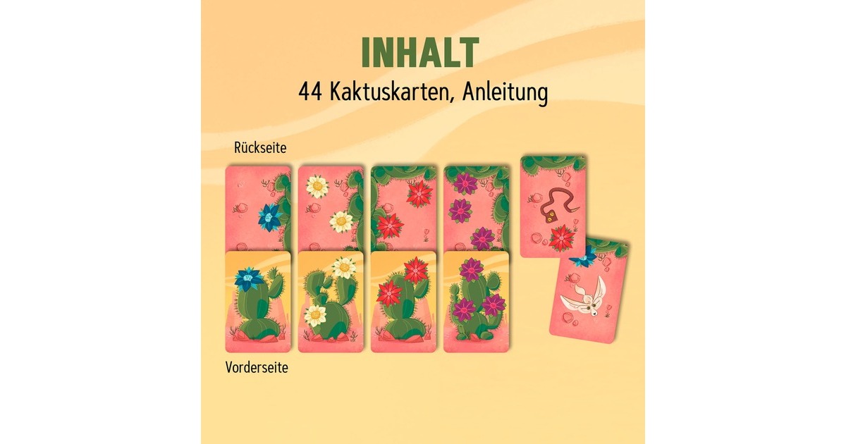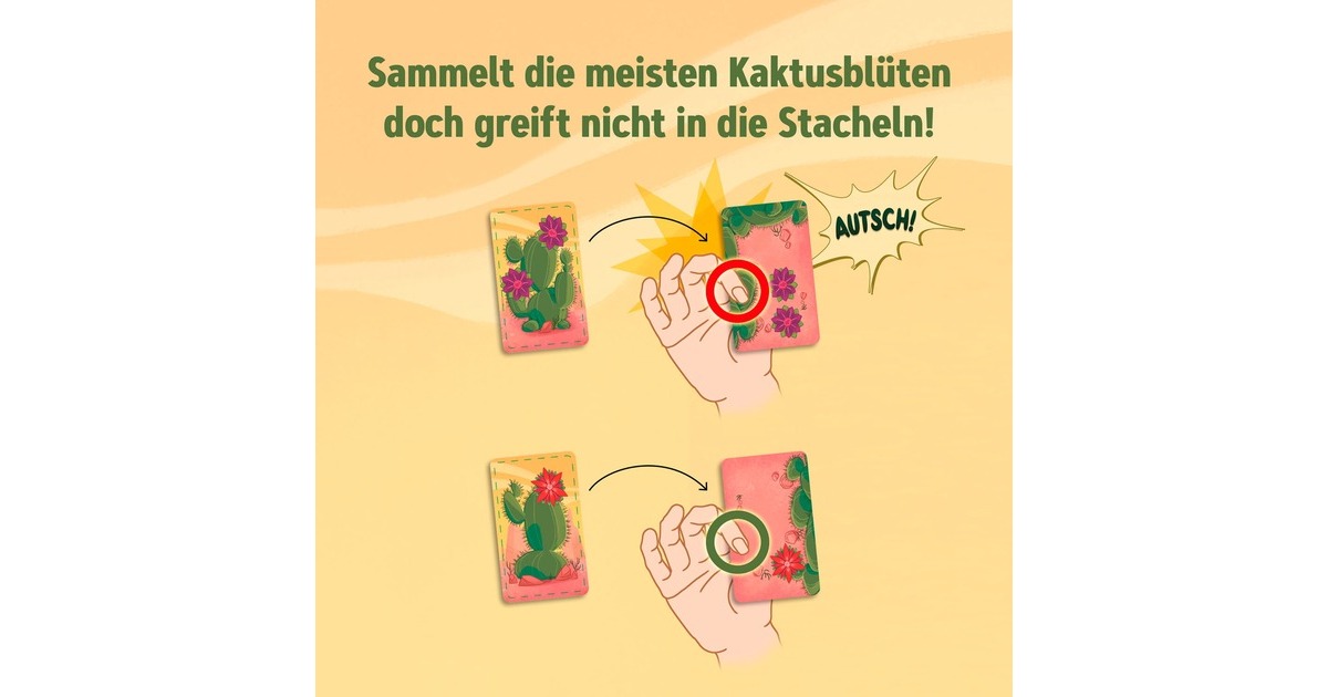 Auf der Vorderseite der Spielkarten in diesem Kartenspiel für 2-4 Spieler sind Kakteen mit unterschiedlich vielen Blüten zu sehen. Die Karten werden eifrig gesammelt - aber Achtung: Je mehr Blüten, desto mehr Stacheln hat der Kaktus. Wer gerade am Zug ist, entscheidet wie die Karte in die Hand genommen wird. Dann schnell zugreifen, die Karte zwischen zwei Fingen halten und umdrehen. In die Stacheln gegriffen? Autsch! Schon fällt die Karte auf den Ablagestapel. Alles gut gegangen? Dann wird die Karte vor sich abgelegt. Wer am Ende des Spiels die prächtigsten Blütensammlung vor sich hat, gewinnt bei diesem stachligen Kartenspiel. Die Wüstentiere Schlange und Fennek bringen dabei lustige Zusatzeffekte mit.Art.-Nr.: 1903584| Altersempfehlung | ab 6 Jahren |
