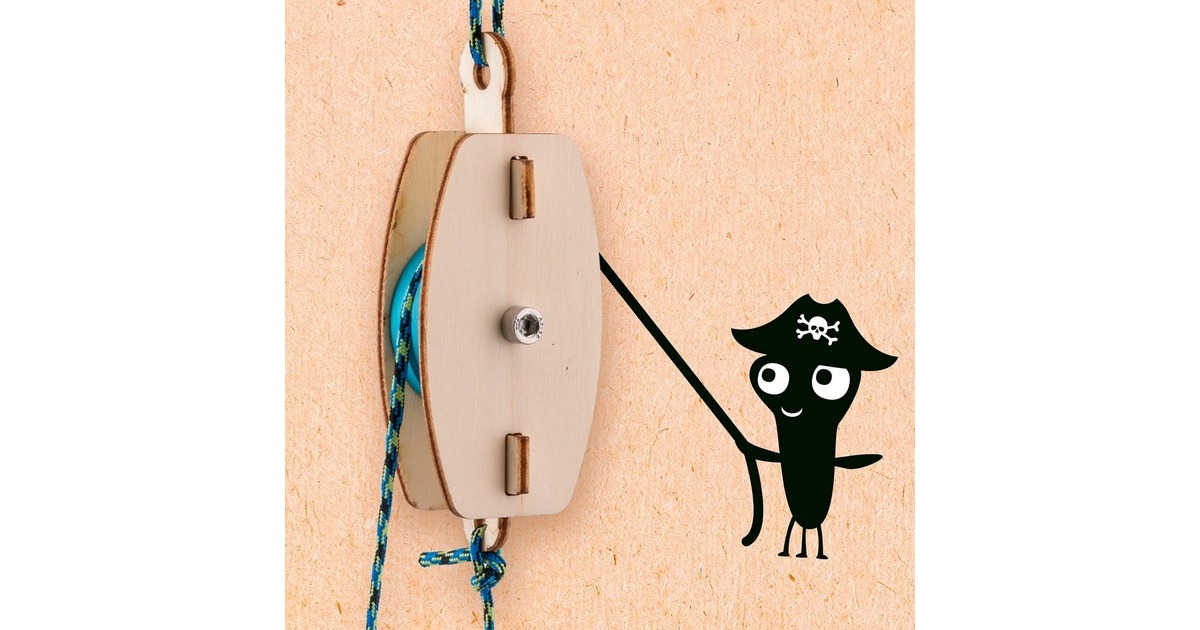 Flaschenzug-Modell aus Holz zum Zusammenbauen, Kunststoffrolle, Metallstift, 3 m blauer Paracord, 6 m bunter Paracord, große sternförmige Perle, Anleitung (16 S.) |