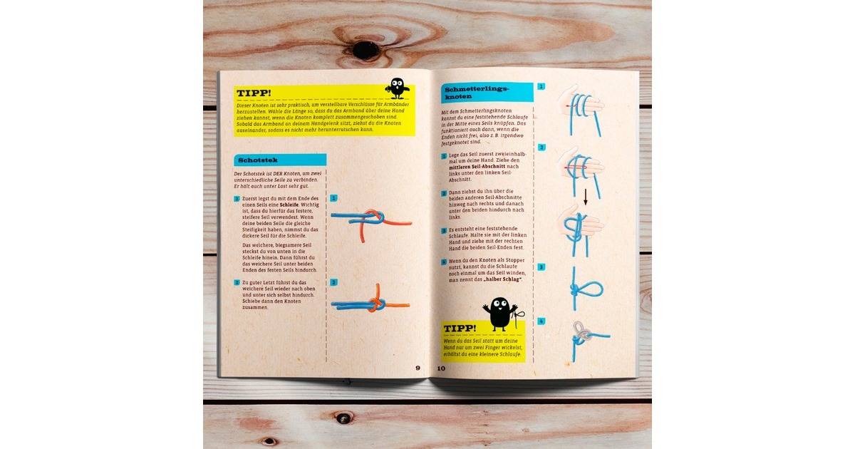 Lustige Knoten-Knobelei mit Überraschungsmoment! Palstek, Kreuzknoten und Co. - mit diesem coolen Bastelset lernen Kinder ab acht Jahren Schritt für Schritt die wichtigsten Knoten, die man fürs Leben braucht. Überraschung: Für das "Meisterstück", einen selbstgeknüpften Schlüsselanhänger, können die neu erlernten Tricks gleich angewendet werden. Als besonderes Highlight enthält der Kasten ein tolles Flaschenzug-Modell aus Holz. So können die frisch gebackenen Knoten-Profis gleich noch ausprobieren, wie man mit wenig Kraft Dinge nach oben befördern kann.Art.-Nr.: 1524674