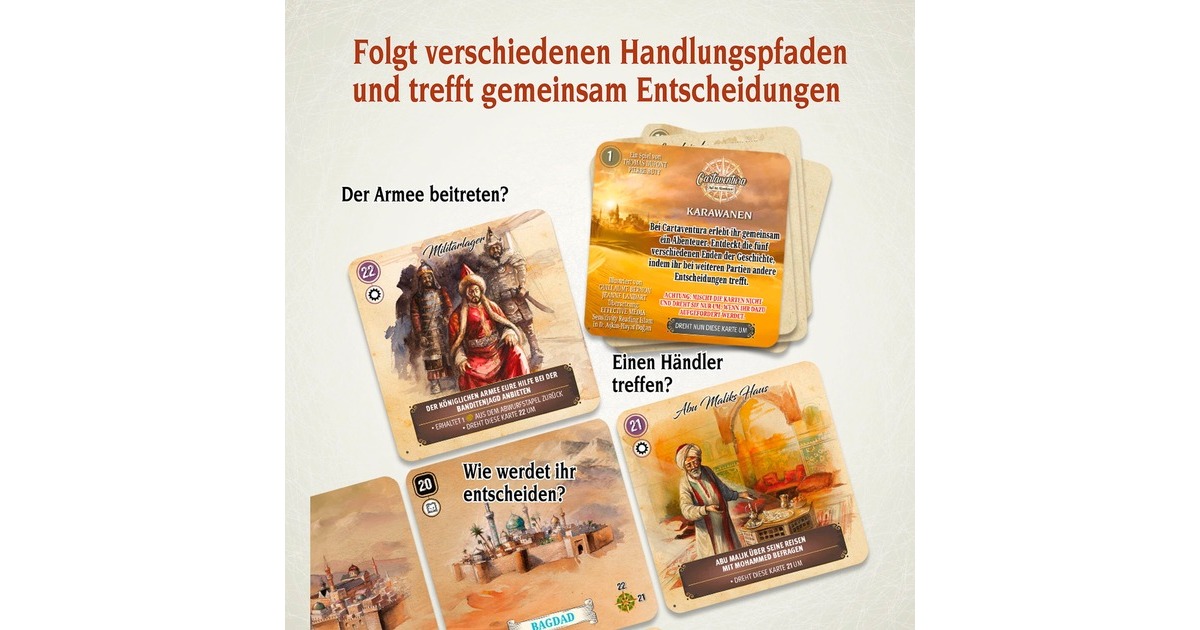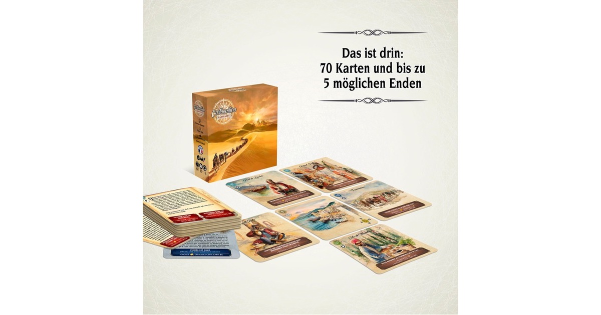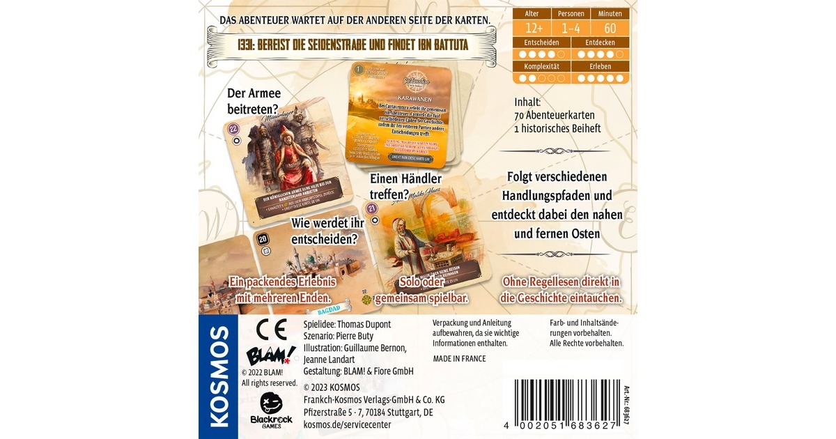 In diesem kompakten Kartenspiel mit einfachen Regeln geht es auf die Spuren von Ibn Battuta im Jahr 1331: Der Reisende gilt als vermisst und sein Cousin macht sich auf eine ungewisse Reise entlang der Seidenstraße. Neue Handelsrouten, viele Gefahren und unzählige Abenteuer warten dort. Zwei Regelkarten führen in dieses kooperative Spiel ein. Einige Karten zeigen Orte, andere erfordern eine Entscheidung oder verweisen auf weitere Karten. Diese können Auswirkungen der Entscheidung beschreiben. So entwickelt sich Karte für Karte eine spannende Geschichte - bis zu einem von mehreren möglichen Enden. Ein spannendes Kartenspiel mit einfachen Regeln, das auf historischen Fakten basiert und dank des kompakten Formats auch gut als Reisespiel genutzt werden kann.Art.-Nr.: 1903573