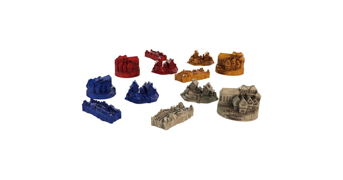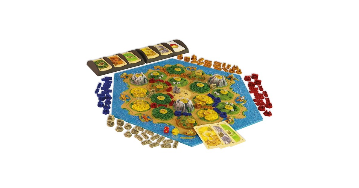 19 bemalte Landschaftsfelder, 6 bemalte Rahmenteile, 9 bemalte Häfen, 96 Spielfiguren, 1 Räuber-Figur, 18 Zahlenchips, 95 Rohstoffkarten, 25 Entwicklungskarten, 4 Baukostenkarten, 2 Sonderkarten, 2 Kartenhalter, 2 Würfel, 1 Spielanleitung, 1 Almanach |