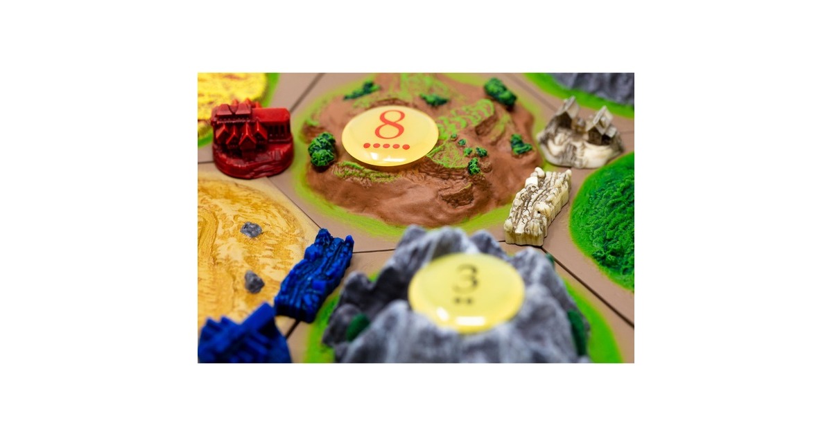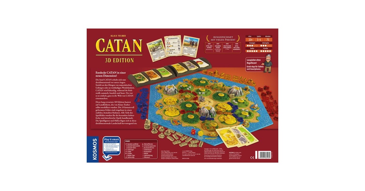 CATAN erwacht zum Leben! Meer, Ackerland, Gebirge, Wälder, Weideland, Wüste: Vor den Augen der SpielerInnen entsteht in diesem Gesellschaftsspiel die berühmte Insel CATAN. In einer dreidimensionalen Welt bauen mutige Siedler Städte, Straßen und handeln mit Rohstoffen. Die fantasievoll geformten Landschaftsfelder sind nach den Vorlagen von Spieleautor Klaus Teuber bemalt und gestaltet. Alle Teile des Spielfeldes wurden für die besonders farbenfrohe und detailreiche Optik handbemalt. Die Spielfiguren und Häfen fügen sich in diese dreidimensionale Landschaft hervorragend ein. Mit der Premium-Ausgabe des Spieleklassikers tauchen 3-4 SpielerInnen jetzt noch tiefer in die Welt von CATAN ein. Das Strategiespiel in 3D ist ein Erlebnis für alle Sinne!Art.-Nr.: 1772426