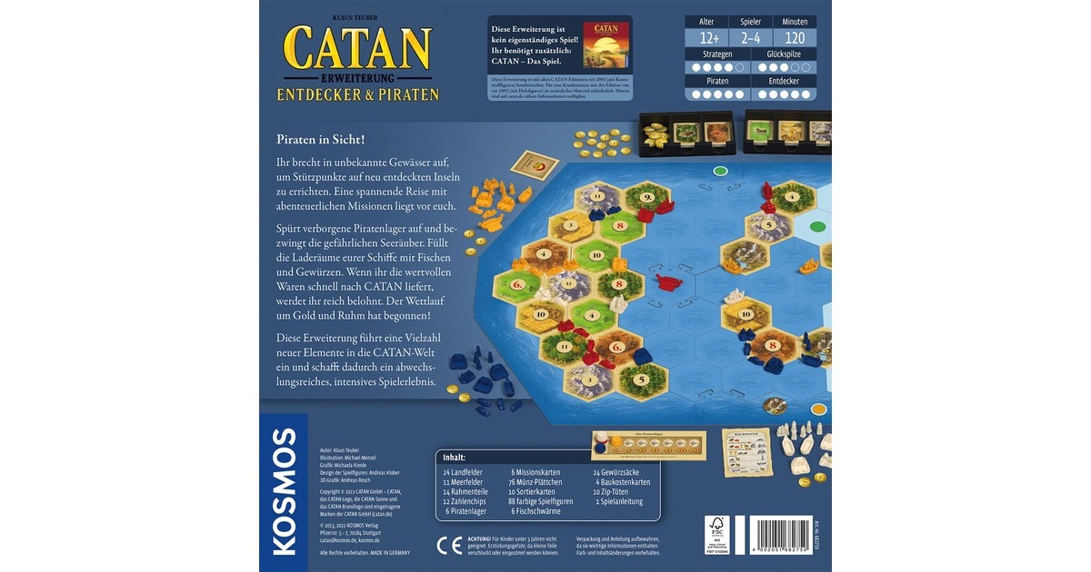 „Piraten voraus“ ertönt der Ruf vom Ausguck. Ein Piratenschiff blockiert die Meerenge, eine Weiterfahrt zum Bestimmungsort ist nicht möglich. „Was tun“ fragt Sie der Kapitän. Angreifen? Tribut zahlen? Ausweichen und einen Umweg in Kauf nehmen? Die Spieler entscheiden! Ist genügend Gold in der Kasse, um sich die Weiterfahrt zu erkaufen? Gibt es andere lukrative Ziele oder eine bequeme Ausweichroute? Ein Schuss vor den Bug ist immer drin, aber was tun, wenn der Pirat nicht beeindruckt ist? In der Erweiterung „Entdecker & Piraten“ nehmen die Spieler Abschied von der Insel Catan, auf der außer den lästigen Räuberbanden nur wenige Gefahren drohen. Ausgesandt vom Catanischen Rat geht es in unbekannte Gefilde, um dort neue Stützpunkte zu errichten. Doch Sie sind nicht nur Entdecker und Siedler – dem Catanischen Rat liegen verschiedene vage Informationen über das Archipel hinter dem Horizont vor. Neue Missionen bringen neue Abenteuer. Diese Erweiterung ist nur in Verbindung mit dem Basisspiel spielbar.Art.-Nr.: 1877929