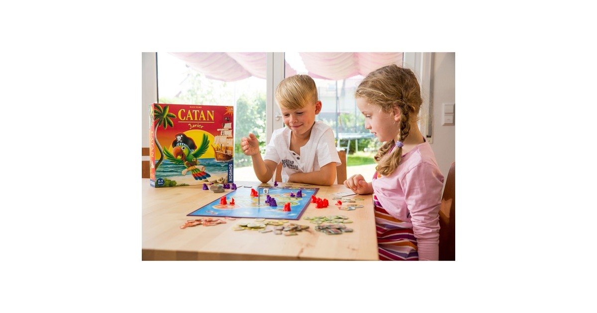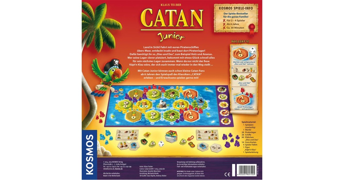 Land in Sicht! Die Spieler fahren als Piraten mit ihren Schiffen übers Meer und entdecken neue Inseln. Mit den "Dies und Das"-Plättchen wie Holz, Schaf, Säbel und Ananas bauen sie neue Schiffe und errichten weitere Piratenlager an den Küsten. Wer seine Lager clever platziert, erhält mit etwas Glück schnell die richtigen Gegenstände, die er für das nächste Lager benötigt. Doch Vorsicht! Das friedliche Piratendasein wird immer mal wieder vom fiesen Käptn Klau gestört, der den Spielern gern in die Quere kommt. Mit der überarbeiteten Neuauflage kann das Kultspiel für die Jüngsten jetzt auch in kleiner Runde erlebt werden. Das Spiel eignet sich für zwei Spieler ebenso gut wie für eine Spielgruppe von drei bis vier CATAN-Fans. Durch die vereinfachten Tauschregeln und die kindgerechten "Dies und Das"-Plättchen haben auch die jüngsten CATAN-Fans jede Menge Spaß beim Spielen.