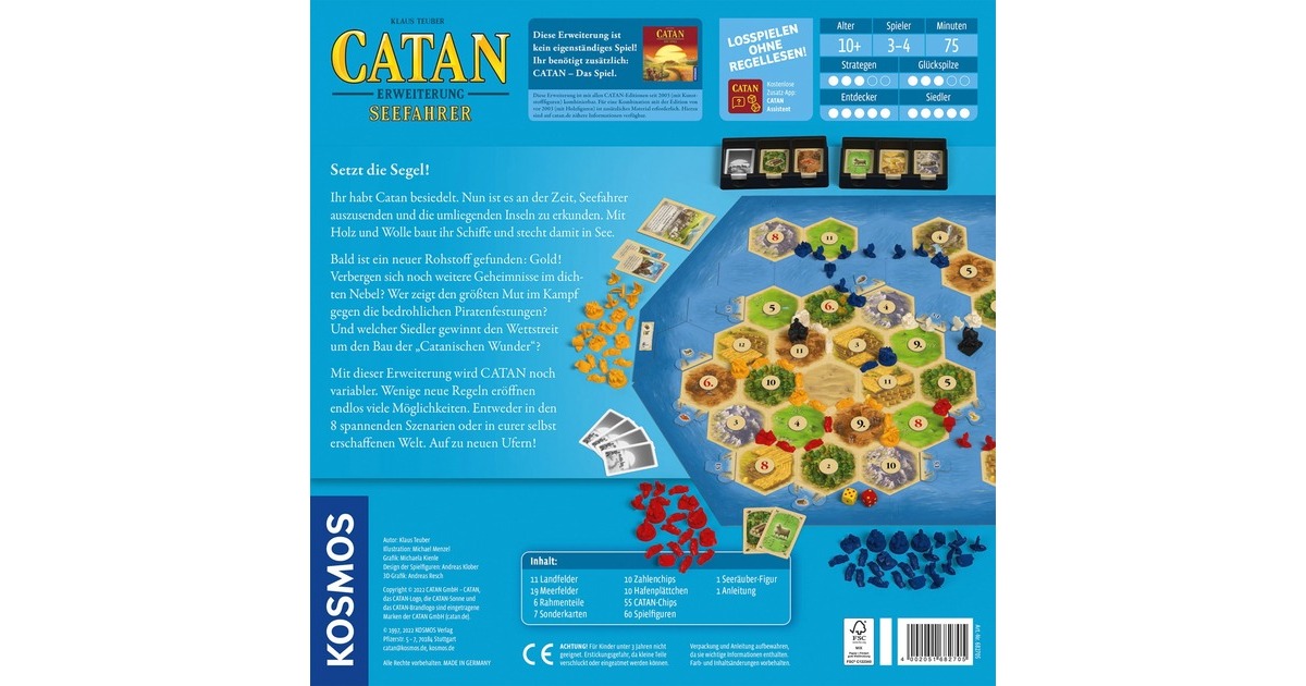 Mit dieser Erweiterung kommen neue spannende Abenteuer: Reist zu „Neuen Ufern“, überlebt auf den „Vier Inseln“ und erforscht „Ozeanien“. „Durch die Wüste“ kommt man zum „Vergessenen Stamm“ und handeln mit diesem „Stoffe für CATAN“. Wenn man CATAN gegen Übergriffe in „Die Pirateninseln“ verteidigt, können zu guter Letzt „Die CATANISCHEN Wunder“ errichtet werden. Danach geht es ins freie Spiel mit unendlich vielen Möglichkeiten. Das Set ist nur in Verbindung mit einem Basisspiel nutzbar.Art.-Nr.: 1877926
