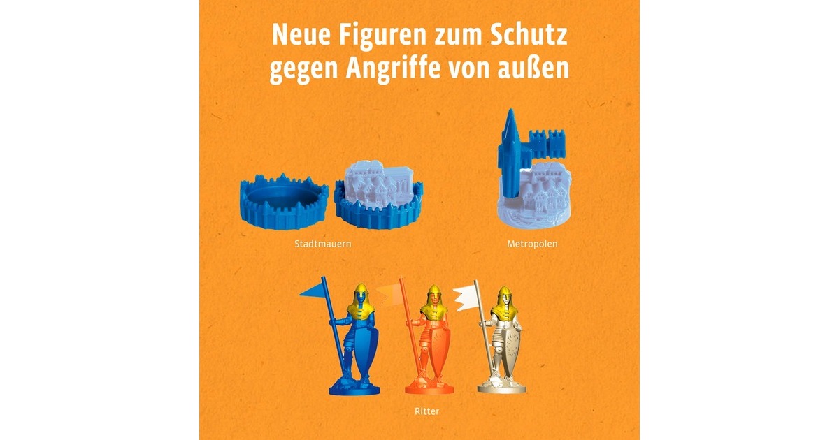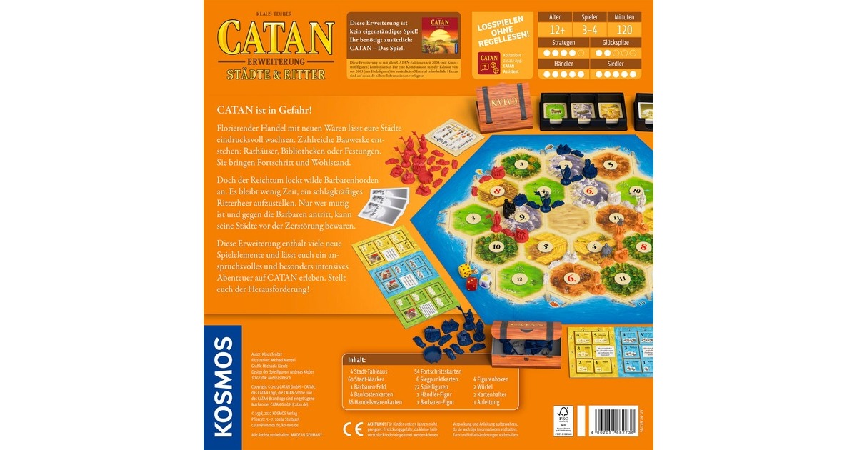 Erleben den Aufstieg CATANS! Florierender Handel bringt Wohlstand. Die Städte blühen und gedeihen. Aber dieser Reichtum lockt auch Barbaren an. Wilde Horden bedrohen die Insel. Es bleibt nur wenig Zeit, ein schlagkräftiges Ritterheer aufzustellen. Wehe den Städten, wenn die Ritter unterliegen! Doch wie viel soll tatsächlich in das Heer investiert werden? Jede Investition bedeutet gleichzeitig weniger Rohstoffe für Handelswaren und Siedlungsbau. Immer gilt es, zwischen Eigennutz und dem Nutzen der Gemeinschaft abzuwägen. Diese Erweiterung ist nur zusammen mit dem Basisspiel nutzbar. Sie ist auch kombinierbar mit den Erweiterungen Seefahrer und Händler & Barbaren.