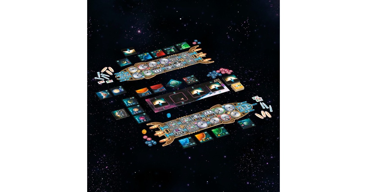2 Sternenschiffe, 18 Produktionszentren, 6 Antriebe, 6 Kanonen, 90 Karten, 2 Würfel, 2 Anleitungen |