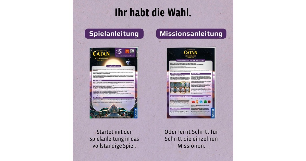 Mit diesem Spiel in der Welt von "CATAN - Sternenfahrer" gehen zwei Spieler auf Entdeckungsreise durchs All: Mit ihren Raumschiffen reisen sie durch die Weiten des Universums. Auch auf fernen Planeten lautet ihre Mission: Handeln und bauen. Sobald ihre Raumschiffe startklar sind, beginnt die Suche nach Handelsplaneten und neuen Stützpunkten. Allerdings sind auch Piraten unterwegs, die von ihrem Reichtum profitieren wollen. Nun braucht es die richtige Strategie: Wer erfüllt die unterschiedlichen Missionen und überwindet die Piraten? Der Einstieg in das Spiel gelingt leicht mit fünf Lernmissionen. Durch die dynamischen Kartenstapel bieten sich immer neue Herausforderungen. Dies ist eine umfangreich überarbeitete Neuauflage des Abenteuers "CATAN - Sternenschiff".
