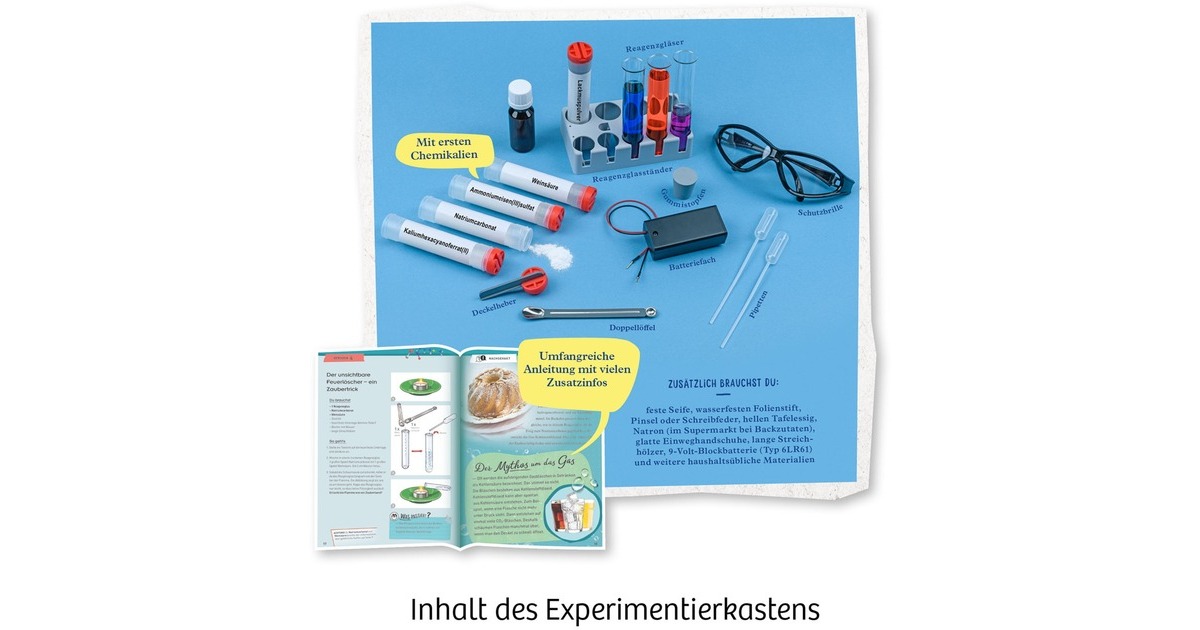 4g Kaliumhexacyanoferrat, 5g Amoniumeisen(lll)sulfat), 12 g Natriumcarbonat, 6g Weinsäure, 1g Lackmus-Pulver, Deckelheber, Doppellöffel, 3 Reagenzgläser, Reagenzglasständer, 3 Pipetten, Lackmus-Fläschchen, Gummistopfen, Schutzbrille, Batteriefach, farbig illustrierte Anleitung (52 S.) |