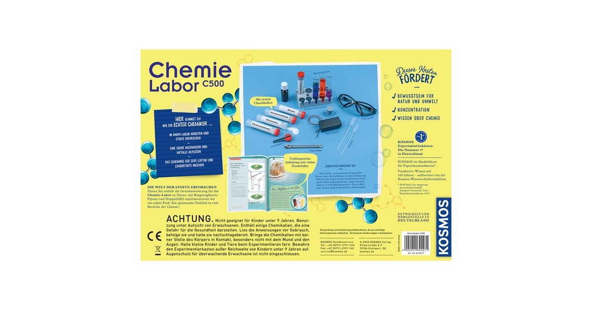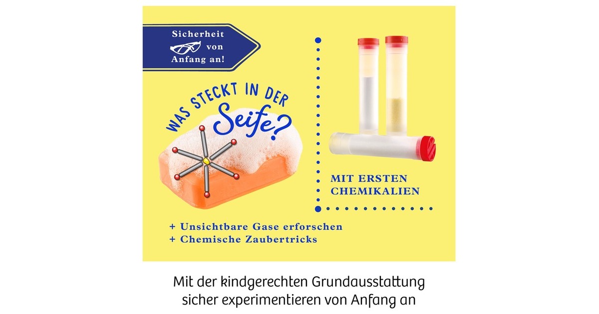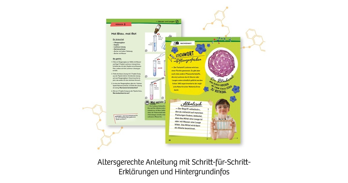Startbereit zum Forschen! Was geschieht, wenn Kohlendioxid entsteht? Wie kann man unsichtbare Gase nachweisen? Was sind Lösungen und wieso schäumt es beim Baden? Mit diesem Schnupperkurs lernen Kinder von 9 bis 13 Jahren in ihrem Labor die wichtigsten chemischen Grundbegriffe wie Lösungen, Stoffgemische, Elemente und Verbindungen kennen und trainieren den richtigen Umgang mit ihrer ersten eigenen Laborausstattung. Schnell finden sie heraus, wie man mit der Pipette Flüssigkeiten dosiert, wofür Petrischalen benötigt werden und wie man mit den vier beiliegenden Chemikalien sicher und versiert umgeht. Die jungen ForscherInnen beobachten das Entstehen von Kohlenstoffdioxid, spüren mit Indikatorlösung Säuren und Basen auf, untersuchen, was es mit Seife und Duschgel auf sich hat, und können sogar einfache elektrochemische Versuche durchführen. Alles Schritt für Schritt und altersgerecht im Anleitungsheft des KOSMOS Experimentierkastens erklärt. Der ideale Einstieg, um erste Erfahrungen in der spannenden MINT-Wissenschaft Chemie zu sammeln.