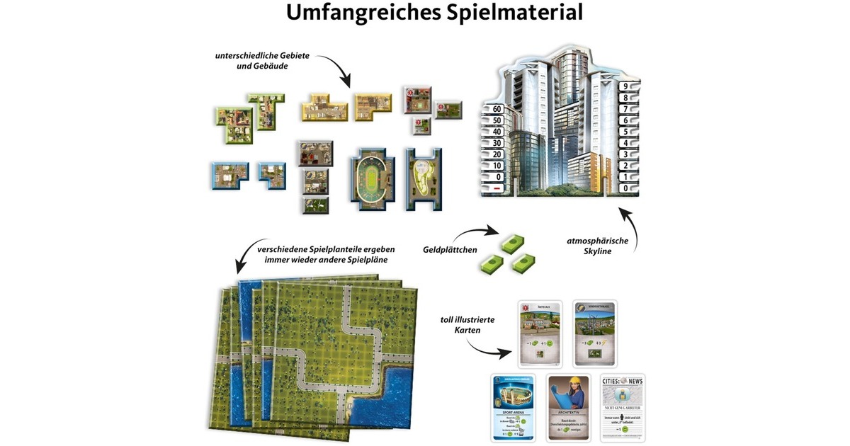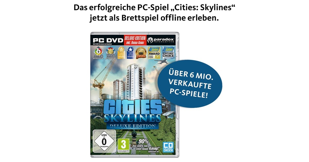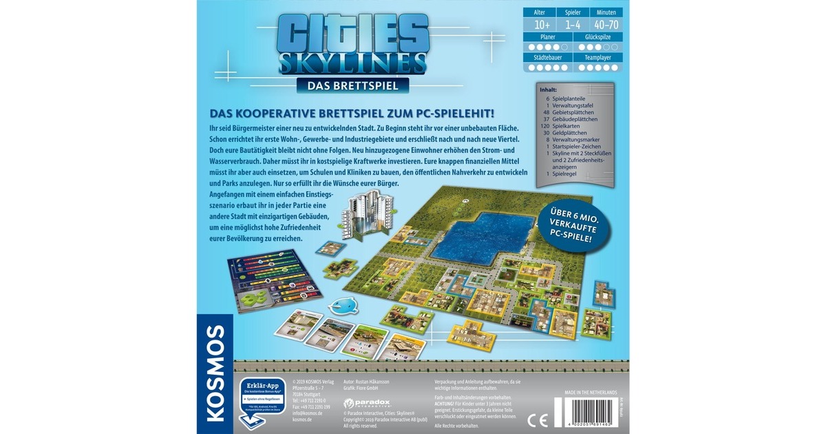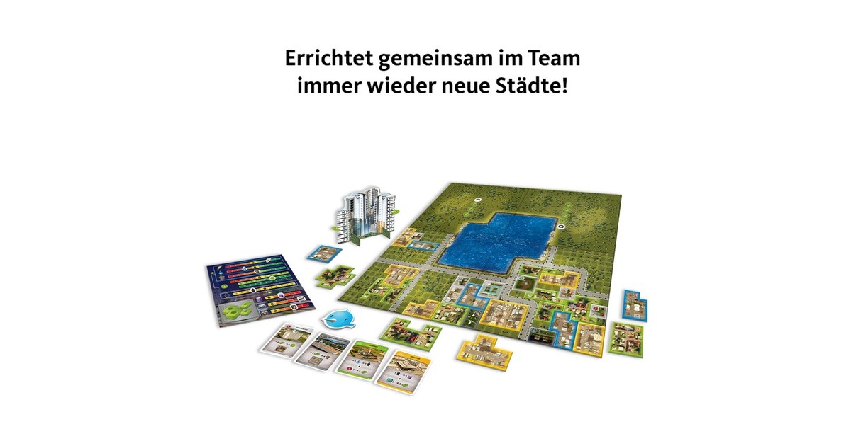 Das erfolgreiche PC- und Konsolenspiel „Cities: Skylines“ ist die Grundlage für das gleichnamige kooperative Brettspiel. Anders als im PC-Spiel wird hier im Team gespielt: Zu Beginn stehen die Spieler vor einer unbebauten Fläche. Sie errichten erste Wohn-, Gewerbe- und Industriegebiete und erschließen nach und nach neue Viertel. Dabei müssen sie zentrale Faktoren wie Umwelt, Kriminalität, Verkehrsfluss und Bildung berücksichtigen und ihre finanziellen Mittel gemeinsam planvoll einsetzen. Ziel ist eine möglichst hohe Zufriedenheit ihrer Bevölkerung.Art.-Nr.: 1560515