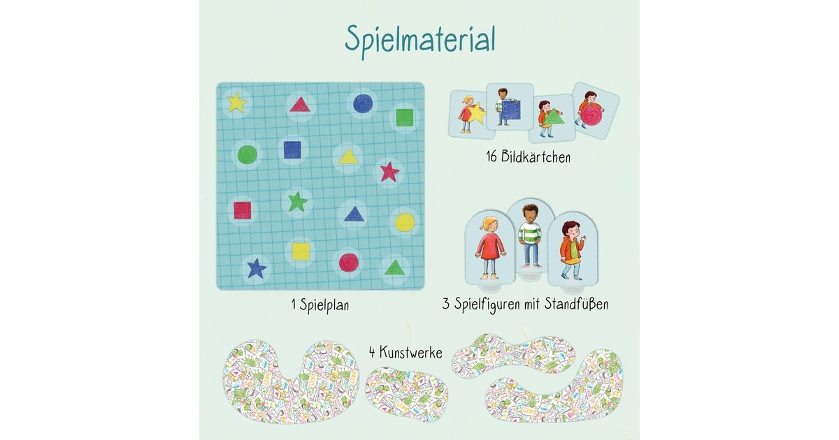 16 Bildkärtchen, 4 Kunstwerke, 3 Spielfiguren mit Standfüßen, Spielplan, Anleitung |