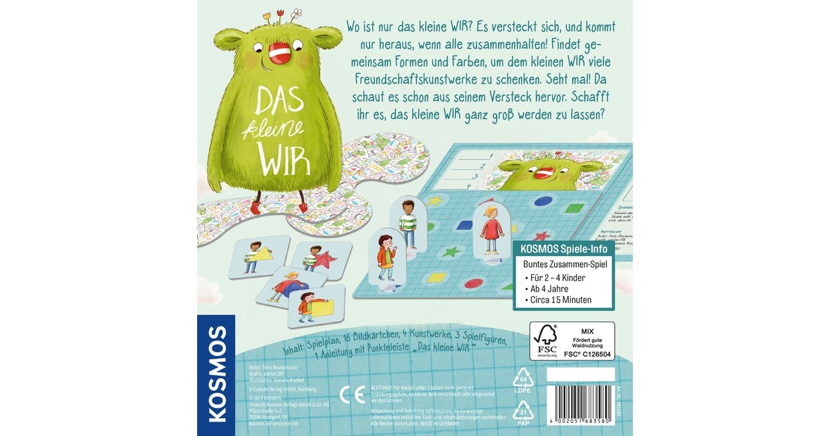 Wo hat sich das kleine Wir denn jetzt wieder versteckt? Es verkriecht sich immer, wenn sich Menschen streiten. Um es zu finden, knobeln zwei bis vier Kinder ab vier Jahren und lösen gemeinsam Aufgaben. Sie lassen das kleine Wir wachsen, indem sie bestimmte Formen und Farben finden und ihre Spielfiguren entsprechend auf dem Spielplan positionieren. Dann ist Geschicklichkeit gefragt: Gelingt es, die bunten Pappteile auf allen drei Figuren zu balancieren? Ganz nach dem Spielmotto "Ein buntes Zusammen-Spiel" ist hier Kooperation gefragt: Nur wenn die Kinder gut zusammenarbeiten traut sich das kleine Wir Stück für Stück hervor. Und wer weiß: Vielleicht entsteht dabei auch eine neue Freundschaft? Passend zur bekannten Kinderbuch-Reihe begeistert dieses kooperative Kinderspiel mit niedlichen Illustrationen.Art.-Nr.: 100022267