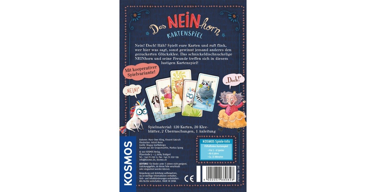 Dieses Einhorn ist einzigartig! Es lebt mit seiner Familie im Herzwald und wird von allen rundum verwöhnt. Trotzdem hat es überhaupt keine Lust, sich gut zu benehmen und haut eines Tages ab! Auf seinem Weg trifft es einen besonderen Waschbären, einen seltsamen Hund und eine außergewöhnliche Prinzessin. Gemeinsam bilden die vier das beste bockige Team, das je gesehen wurde! Ganz schön schnell wird dieses Kartenspiel gespielt. Dabei deckt jeder Spieler abwechselnd eine Karte für alle erkennbar auf und sagt sofort das Wort, das zum aufgedeckten Tier passt. Mit dem NEINhorn von Erfolgsautor Marc-Uwe Kling und seinen Freunden machen Wortspiele noch mehr Spaß.Art.-Nr.: 1733183