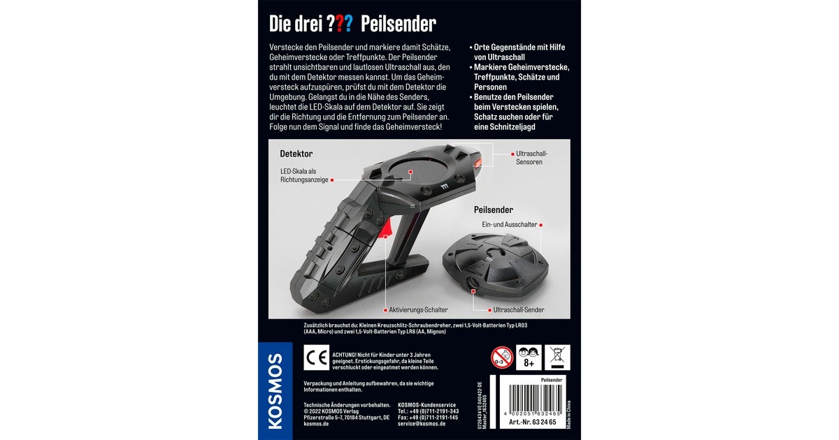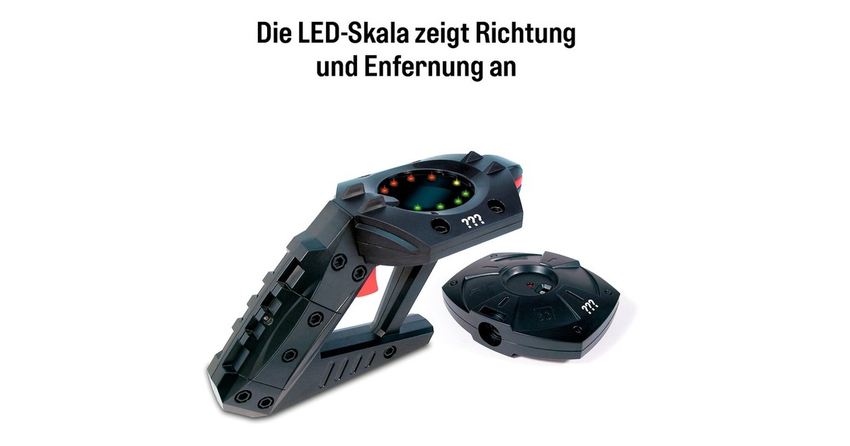 Mithilfe von Schall spannende Detektiv-Fälle lösen: Mit diesem Peilsender suchen Kinder ab 8 Jahren zum Beispiel einen Schatz oder einen Verdächtigen, der sich in der Wohnung, im Garten oder im Klassenzimmer versteckt hält. Wie sie dabei am besten vorgehen, erklärt ihnen die Anleitung. Das Kind mit dem Sender wählt ein Versteck und das andere beginnt mit der Suche. Die LED-Skala am Ultraschall-Detektor zeigt kleinen Spürnasen an, ob sie sich beispielsweise in die richtige Richtung bewegen, dem Versteck näher kommen und wie sie ihre Route korrigieren müssen.Art.-Nr.: 1904829