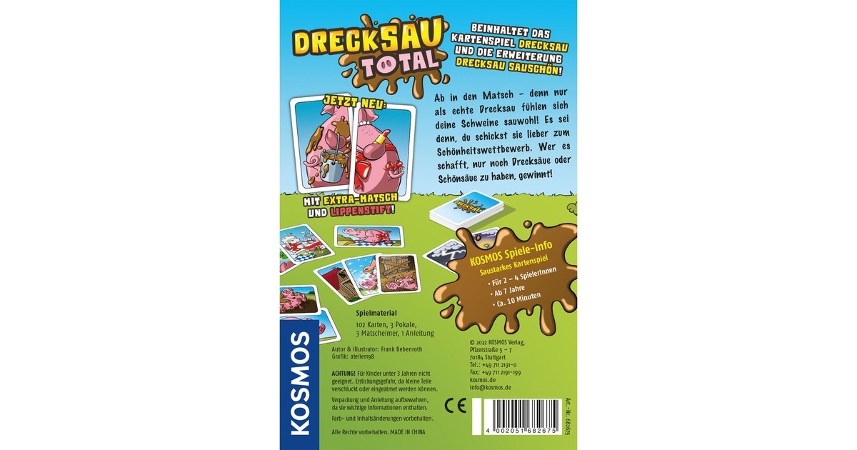 Bei Drecksau total ist ein Matschbad ist der allergrößte Traum. Spielerinnen und Spieler erhalten in diesem Kartenspiel ihre eigenen Schweinekarten, die sie vor sich ablegen. Dazu kommen drei Aktionskarten auf die Hand. Ziel des Grundspiels ist, die ausliegenden Schweinekarten so richtig schön matschig zu machen. Oder doch nicht? Wer Lust auf einen Schönheitswettbewerb hat, greift zur enthaltenden Erweiterung: Hier wollen die Schweine schön herausgeputzt werden. Nach jeder Runde gibt es Matscheimer oder Pokale zu gewinnen. Dieses turbulente Kartenspiel mit zwei zusätzlichen Aktionskarten „Lippenstift“ und „Extra-Matsch“ kommt in einer Magnetbox und kann daher immer und überall mit dabei sein. Art.-Nr.: 1849264