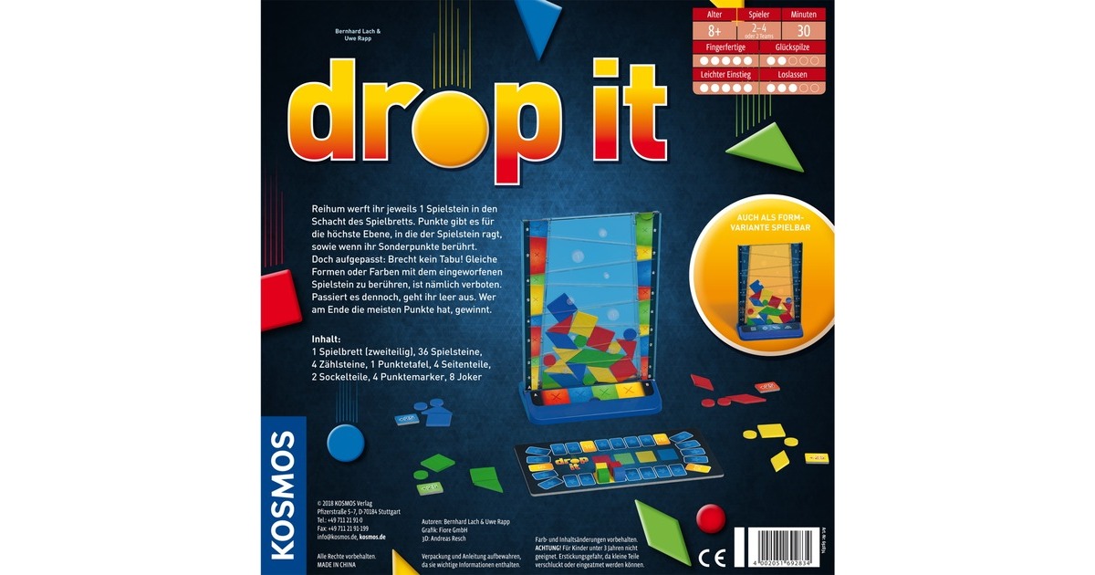 Geschicklichkeit und Taktik sind bei diesem Familienspiel gefragt. Reihum werfen die Spieler jeweils einen Spielstein in das Spielbrett. Punkte gibt es für die höchste Ebene, in die der Spielstein ragt sowie wenn Sonderpunkte berührt werden. Doch Vorsicht: Gleiche Formen oder Farben mit dem eingeworfenen Spielstein zu berühren, ist verboten. Passiert es dennoch, geht der Spieler leer aus. Wer am Ende die meisten Punkte hat, gewinnt. Auch in Teams spielbar! Für 2 - 4 Spieler oder 2 Teams ab 8 Jahren.Art.-Nr.: 1421715