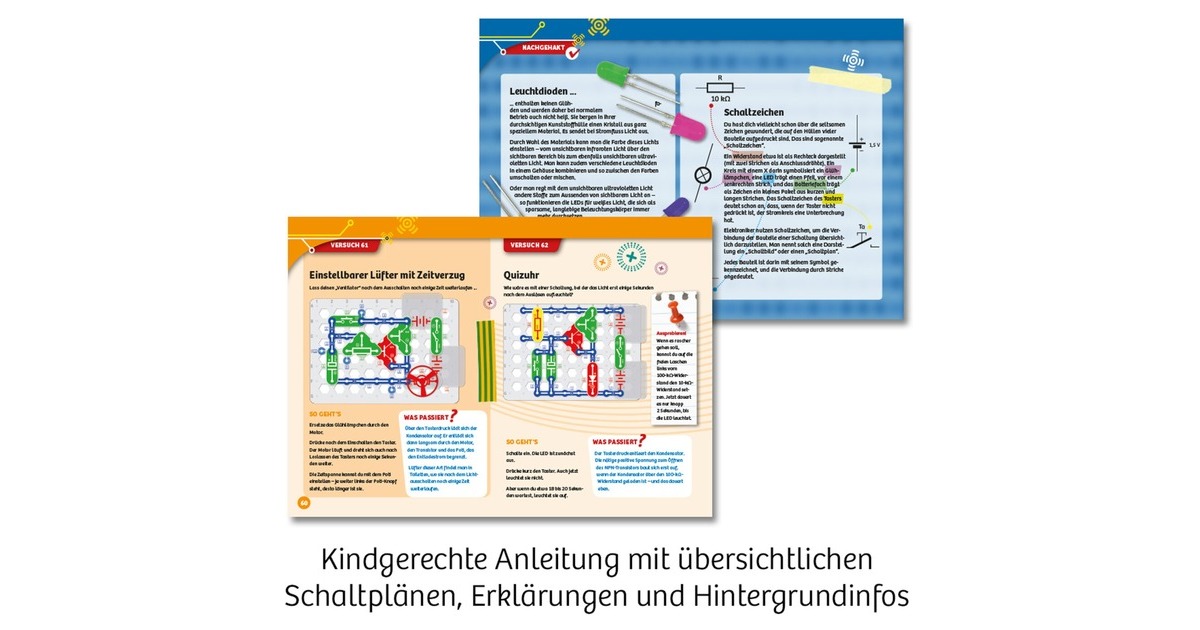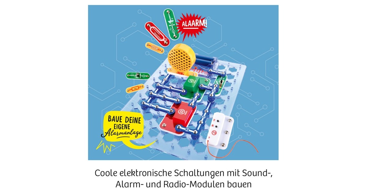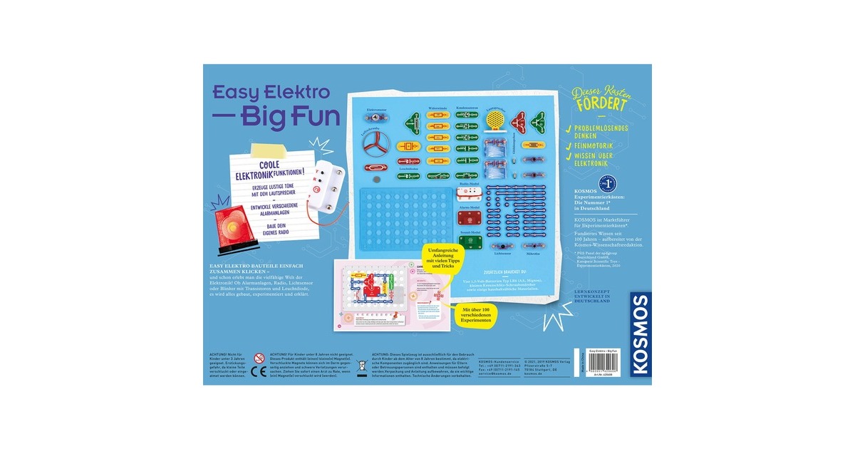 Der Easy Elektro - Big Fun Experimentierkasten von KOSMOS ist ein toller perfekte Spielgefährte für junge Tüftler und Elektronik-Begeisterte. Mit diesem Kit bauen Kinder nicht nur ein eigenes Radio oder generieren mit Lautsprecher und Mikrofon amüsante Töne, sondern lernen auch, Schaltkreise durch einen Lichtsensor zu steuern und unterschiedliche Alarmsysteme zu konzipieren. Das Verständnis für elektronische Prozesse wird ganz nebenbei und mit viel Vergnügen geschärft. Die Handhabung dieses Kits ist denkbar simpel: Das Easy Klick-System von KOSMOS ermöglicht es, die Bauteile schnell und sicher miteinander zu verbinden. Für eine reibungslose Anwendung sorgen durchnummerierte Bauelemente und eine ausführliche Anleitung mit präzisen Beschreibungen und Schaltplänen. Die zusätzlichen „Nachgehakt“-Seiten bieten wertvolles Wissen, welches spielerisch und mit alltagsnahen Bezügen die elektrotechnischen Grundlagen erklärt. So wird Wissen greifbar und Technik faszinierend. Easy Elektro - Big Fun ist die Eintrittskarte in eine Welt voller Entdeckungen und Kreativität - ein durchdachtes Konzept für kindgerechtes Lernen und jede Menge Spielspaß. Der Spaß an Technik und Elektronik beginnt hier!Art.-Nr.: 100045323