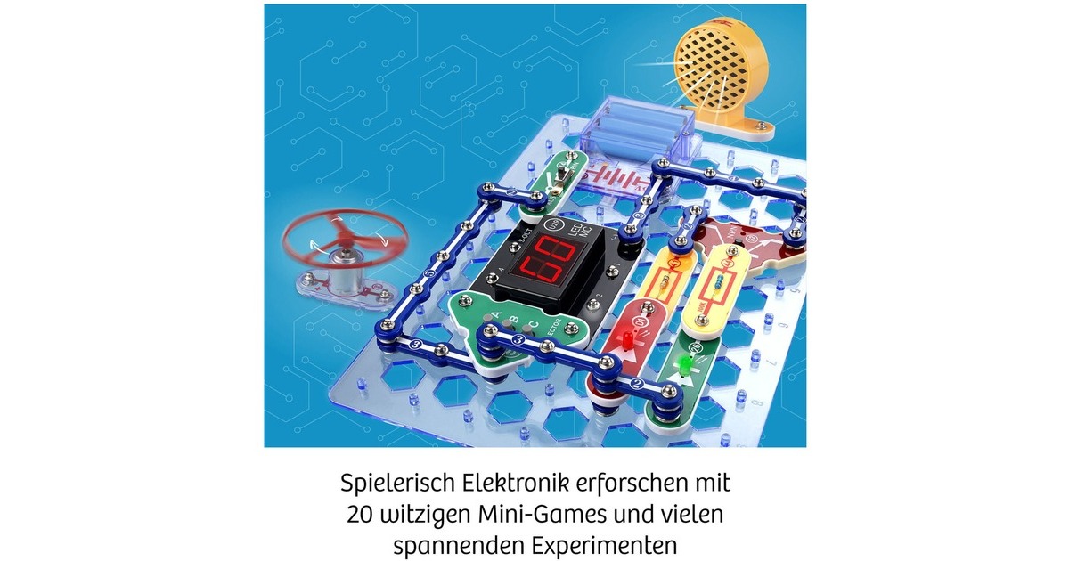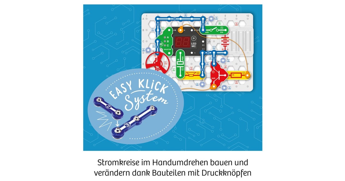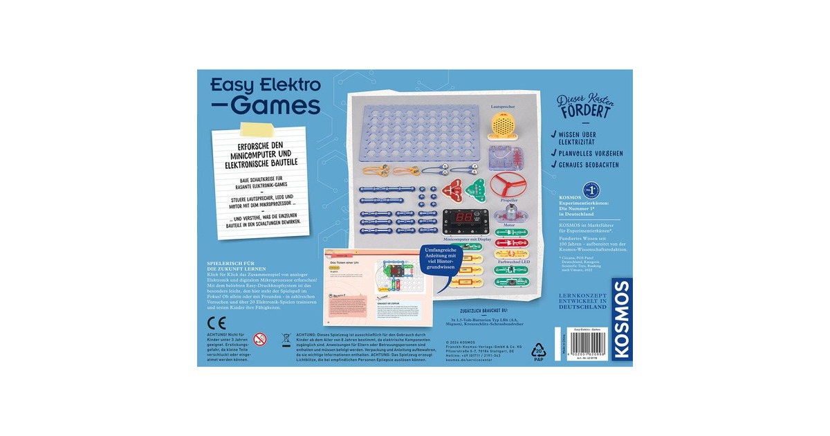 Entdecke spielerisch die faszinierende Welt der Elektronik mit dem Experimentierkasten Easy Elektro - Games von KOSMOS! Kinder im Alter von 8 bis 12 Jahren werden zu kleinen Ingenieuren, indem sie mit dem Easy-Klick-System ihre eigenen Spiele erfinden. Über 60 Experimente laden zu einer Reise in das Reich von Strom und Schaltkreisen ein, wo selbst konzipierte Minispiele auf Knopfdruck zum Leben erwachen. Ob Rätsel, die deine grauen Zellen herausfordern oder Geschicklichkeitsspiele, die deine Hand-Auge-Koordination auf die Probe stellen - hier kommt echte Arcade-Atmosphäre auf. Ein Mikrocontroller und eine bunte Leuchtanzeige lassen jedes Spiel in einem aufregenden Licht erstrahlen. Die Anleitung enthält jede Menge Wissenswertes, begleitet von Bildern, die durch die spannenden Projekte führen. Und das Beste: Kombiniere diesen Kasten mit anderen, separat erhältlichen Sets aus der Easy-Reihe und die Möglichkeiten werden so vielfältig wie die Elektronik selbst. Mit Easy Elektro - Games von KOSMOS wird Lernen zu einem Abenteuer voller Kreativität und Spaß!Art.-Nr.: 100045322