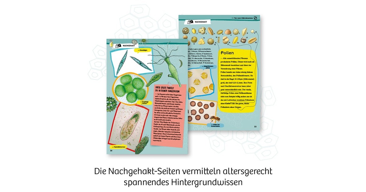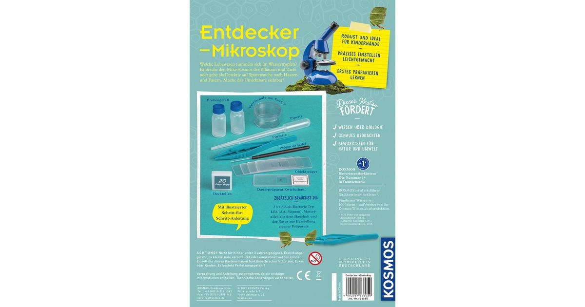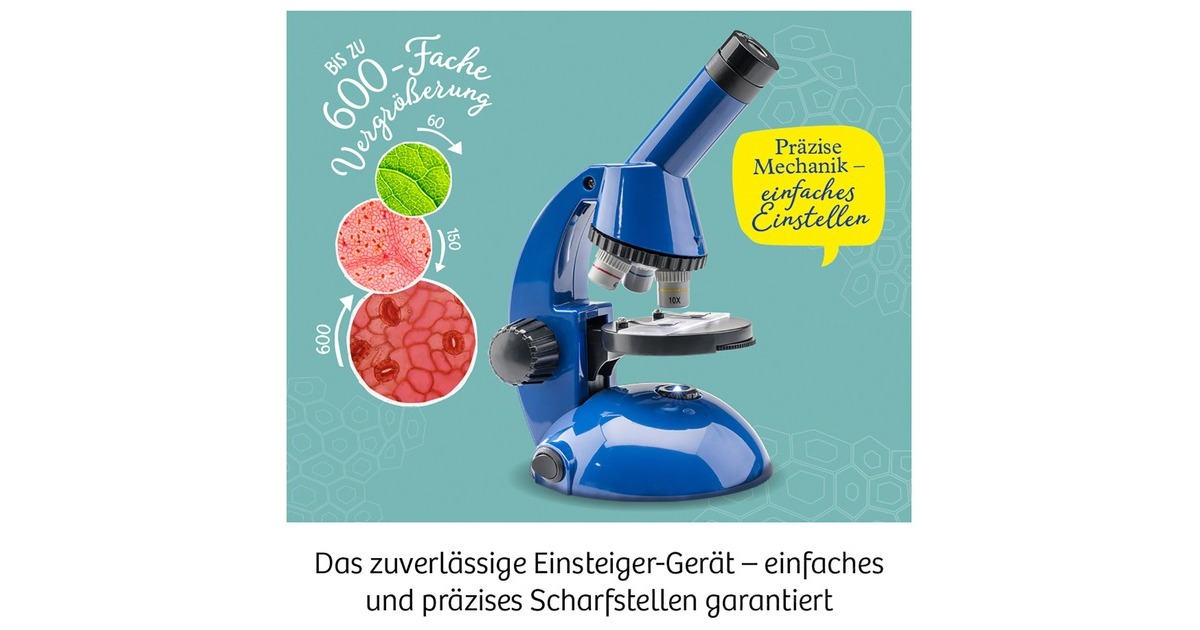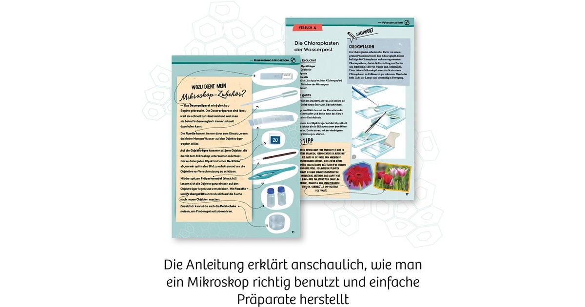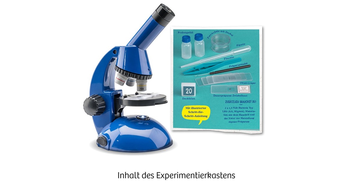 Mikroskop (bis zu 600fache Vergrößerung) mit batteriebetriebener LED-Beleuchtung, Präparierzubehör (Objektträger (Kunststoff), Deckglasfolien, Pipette, Pinzette, Präpariernadel, Probengefäße), farbige Anleitung |