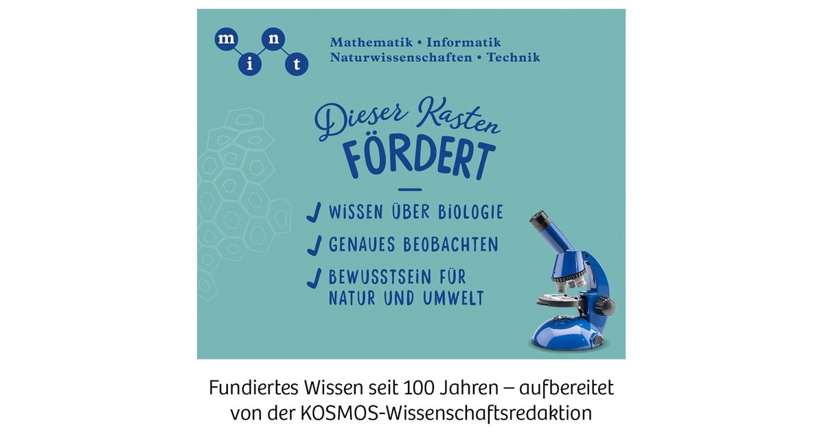 Nicht zu glauben, was sich in Wassertropfen, Staub, Blütenpollen oder sogar Haaren verbirgt! Mit dem Experimentierkasten Entdecker-Mikroskop von KOSMOS erforschen Kinder ab 8 Jahren eine faszinierende Welt im Miniformat. Dank der qualitativ hochwertigen Objektive, Okulare und Linsen ist eine bis zu 600fache Vergrößerung der Präparate möglich. Die bebilderte Anleitung beschreibt genau, wie das Einsteiger-Mikroskop richtig eingestellt, einfache Versuchsobjekte vorbereitet und unter Durchlicht untersucht werden. Angehende Forscher und Detektive dürfen sich auf zauberhafte Muster, Zellen und Kleinstlebewesen freuen, die sie mit bloßem Auge in Natur und Haushalt niemals entdecken würden. Ein Mikroskop für Kinder und Anfänger.Art.-Nr.: 1601249