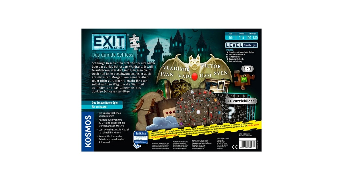 Mystery zum Puzzeln und Rätseln in einem! Aufregende Abenteuer warten auf Einsteiger in diesem kooperativen Escape Room Spiel: Jeder kennt das gruselige Schloss am Waldrand und jeder fürchtet sich davor. Jetzt ist Mut gefragt! Gemeinsam suchen die Spieler einen alten Mann, der spurlos verschwunden ist. Noch am Tag zuvor hatte er auf dem Dorfplatz verkündet, endlich den unheimlichen Schlossbesitzer ausfindig zu machen. Was ist auf der anderen Seite des Waldes geschehen? Die Spieler müssen dem Entführten schnell zur Hilfe eilen! Dafür lesen sie die Abenteuergeschichte und setzen nacheinander vier Puzzles zusammen, die sie an einsame Orte und in schaurige Räume führen. Sie bestehen gemeinsam Gefahren und lösen clevere und überraschende Rätsel. Bei diesem Escape Room Spiel hilft das ganze Team mit!Art.-Nr.: 1732226
