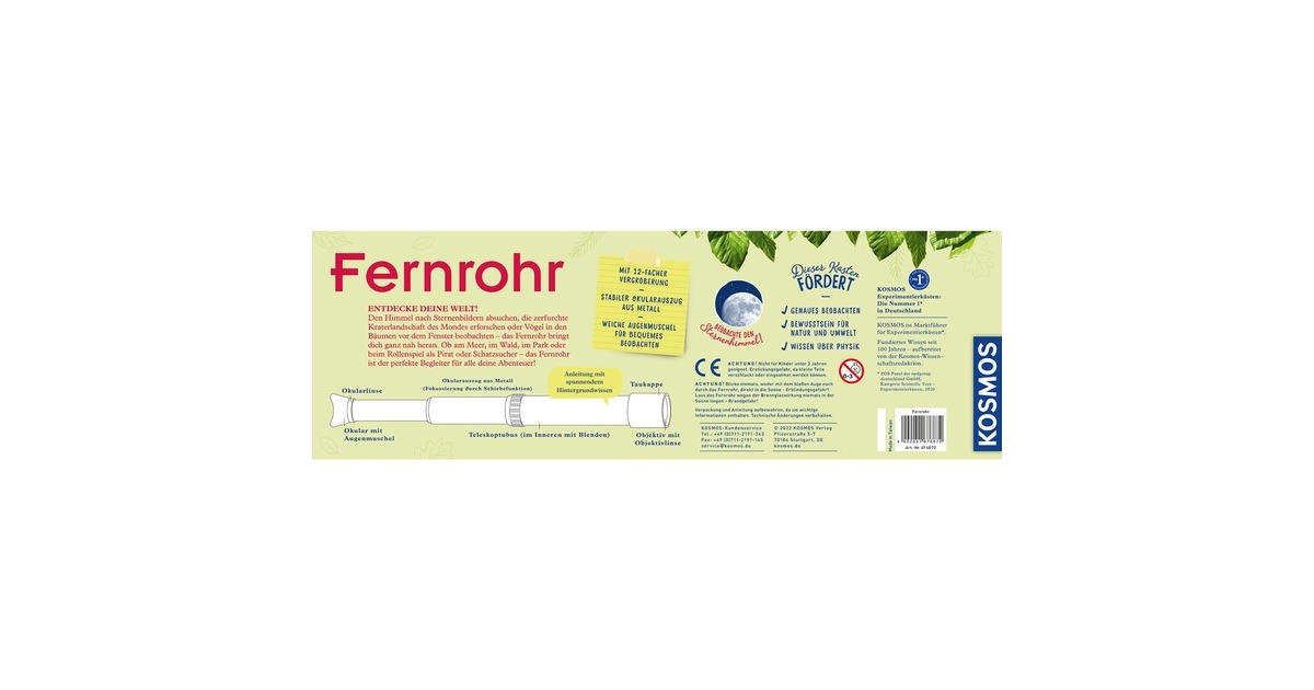 Den Himmel nach Sternenbildern absuchen, die zerfurchte Kraterlandschaft des Mondes erforschen oder Vögel im Wald oder vor dem Fenster beobachten – das Fernrohr von KOSMOS bringt Kindern unerreichbare Weiten ganz nah heran. Das Linsenfernrohr mit der 12facher Vergrößerung und ausziehbarem Metalltubus lässt sich leicht und präzise einstellen. In der Anleitung erfahren Kinder von 8 bis 12 Jahren wie ein Linsenfernohr aufgebaut ist. Sie hält außerdem Tipps bereit, wie das Fernrohr am besten für Beobachtungen eingesetzt wird. Ob am Meer, im Wald, im Park oder beim Abenteuer- und Rollenspiel als Pirat oder Schatzsucher: Dank seines robusten Aufbaus ist das Fernrohr der perfekte Begleiter bei Ausflügen oder im Urlaub.Art.-Nr.: 1877998
