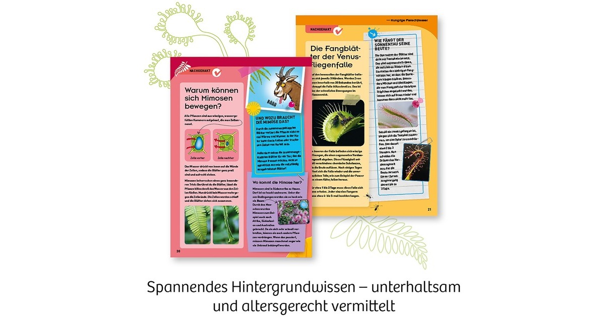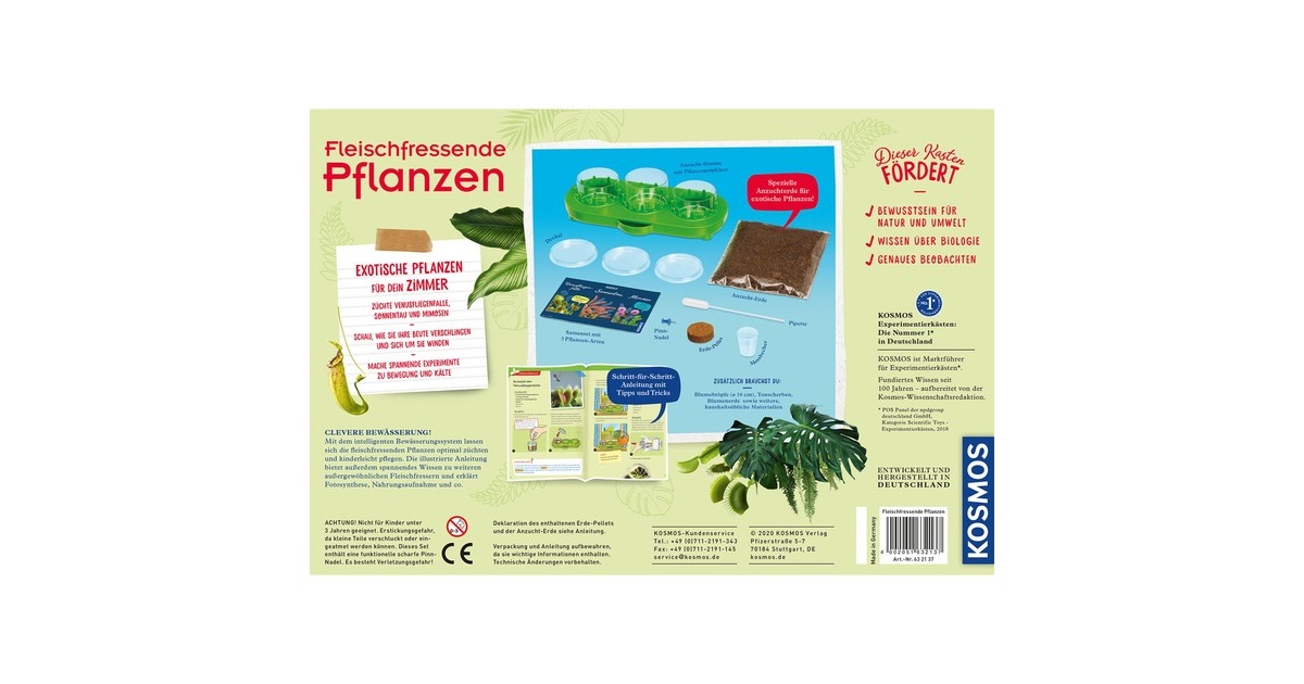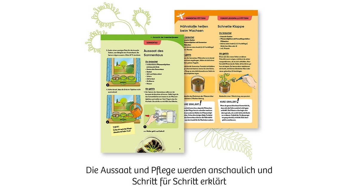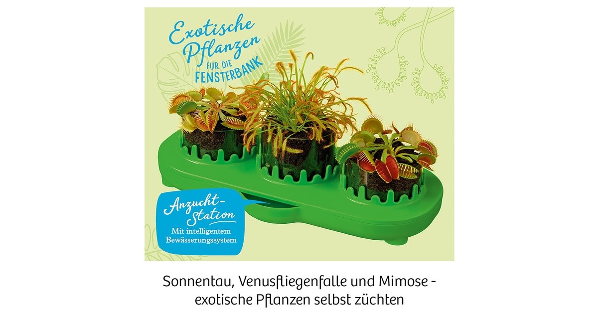 Dieser Garten ist besonders! Für Venusfliegenfalle und Sonnentau sind die Bedingungen in der Anzucht-Station von KOSMOS perfekt. Kinder beobachten die Pflanzen vom Keimen bis zum ersten Vertilgen von Insekten – und das ist spannend! Denn bei der Jagd geht jede Pflanze anders vor: Während die Venusfliegenfalle mit ihrem Dornenmaul zuschnappt, windet der Sonnentau seine klebrigen Fangarme um seine Beute. Aber auch die schnell wachsende Mimose eignet sich mit ihren blitzschnellen Reaktionen für tolle Experimente! In der Anleitung erfahren kleine Nachwuchs-Gärtner*innen, wie sie die Pflanzen richtig pflegen und das intelligente Bewässerungssystem nutzen. Außerdem erwartet sie in diesem Experimentierset viel spannendes Hintergrundwissen rund um Venusfliegenfalle, Sonnentau und andere fleischfressende Pflanzen.Art.-Nr.: 1601245