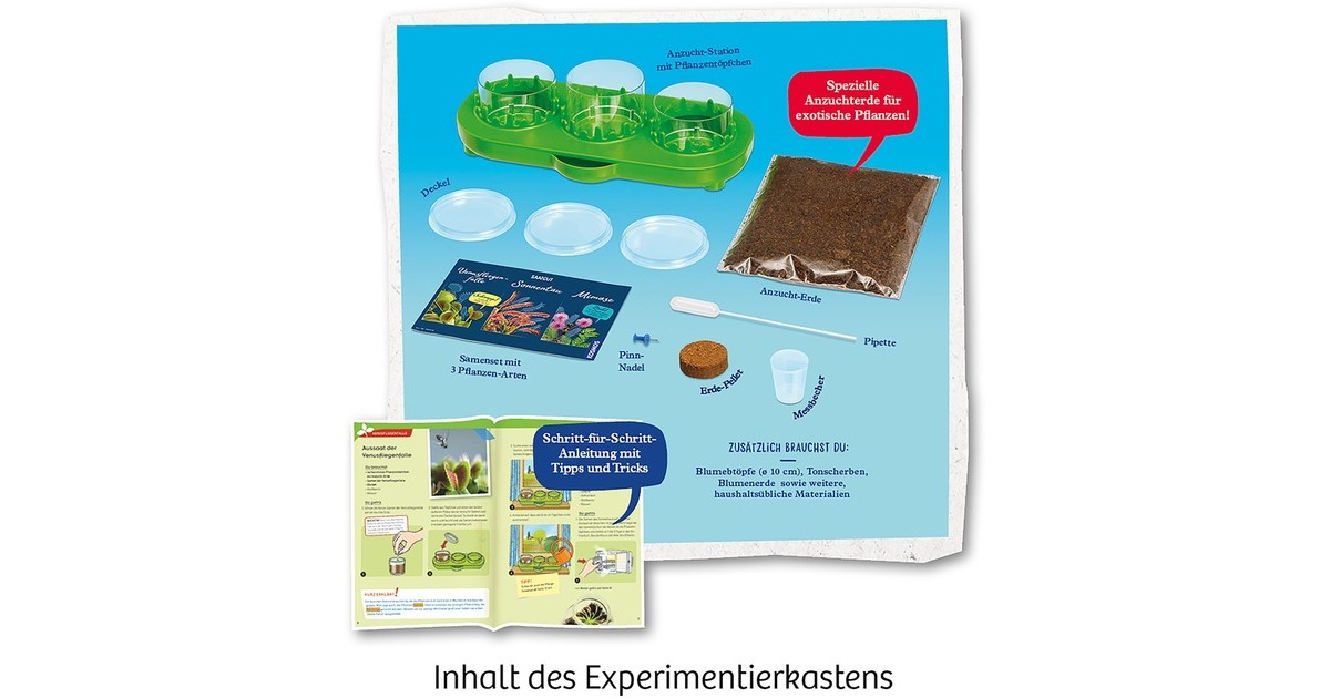 Anleitung (32 Seiten), Aufzuchtstation, 3 Pflanzentöpfchen, 3 Deckel für Pflanzentöpfchen, Anzuchterde, Erde-Pellet, Samenset (Venusfliegenfalle, Sonnentau, Mimose), Messbecher, Pipette, Pinn-Nadel |