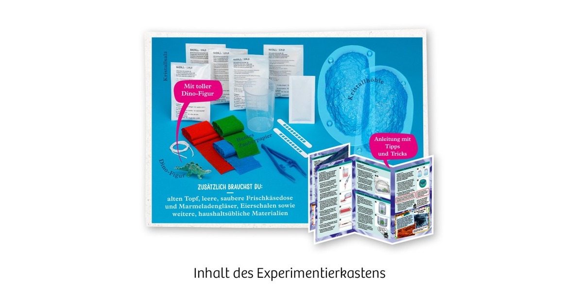 Kaliumaluminiumsulfat, Kreppapier, Tiefziehteil Höhle, Baumwollschnur, Lebensmittelfarbe, Dinifigur, Pinzette, Messbecher, Spatel, Anleitung |