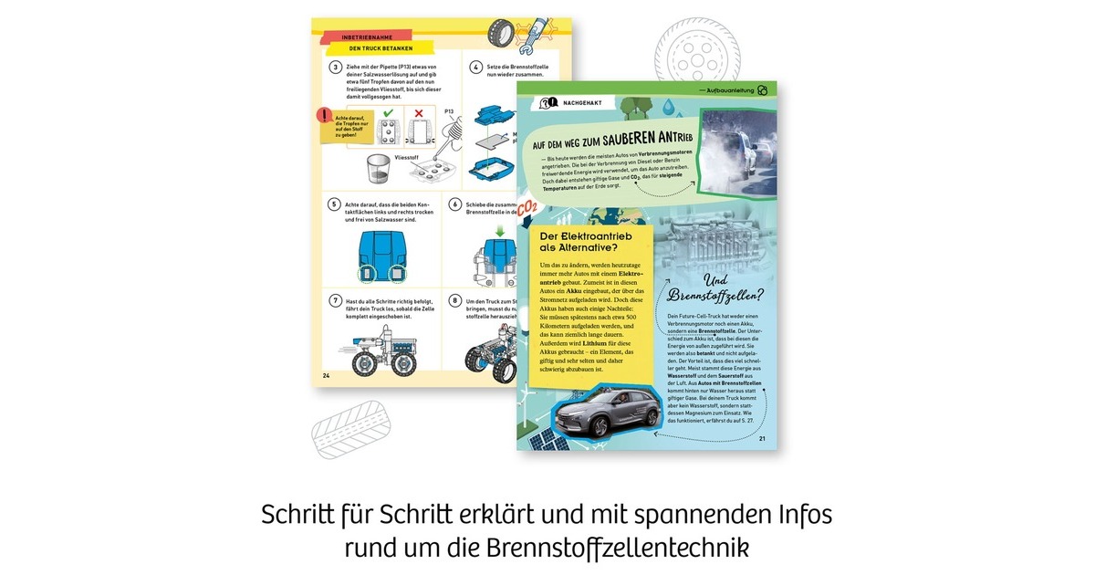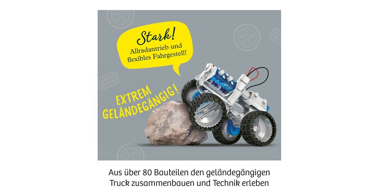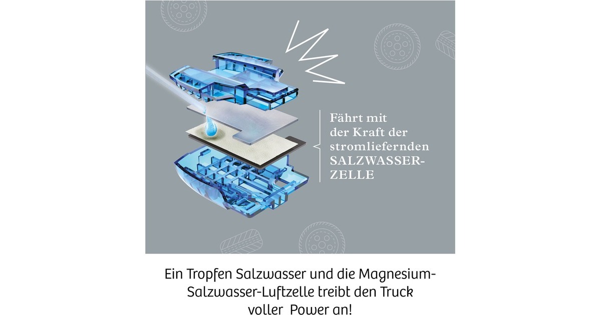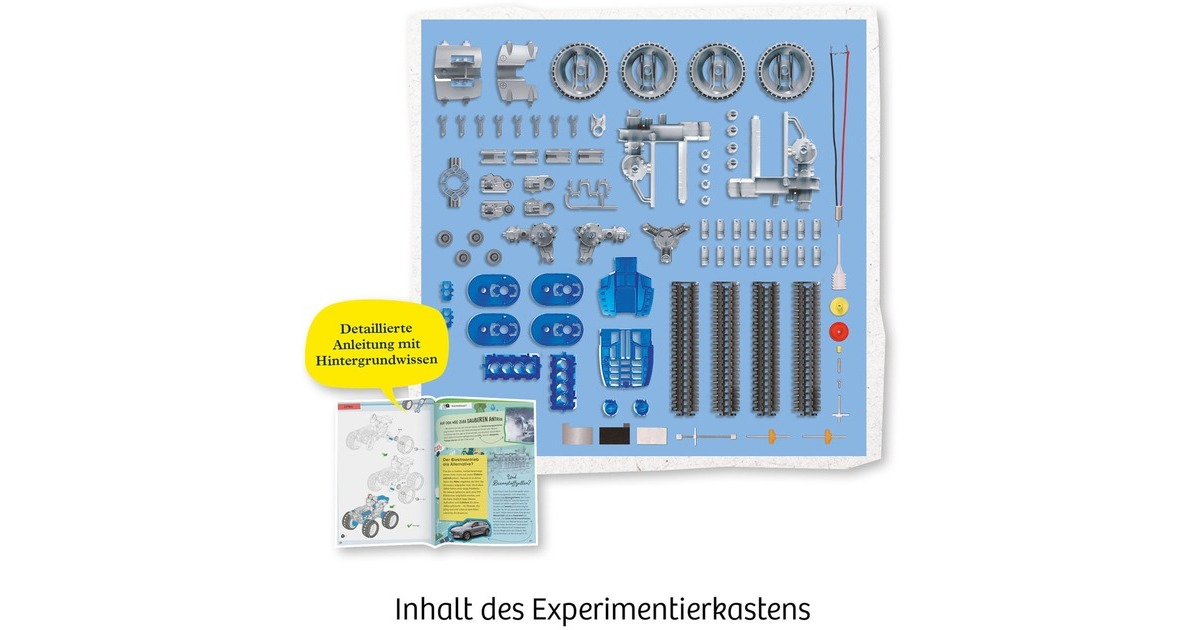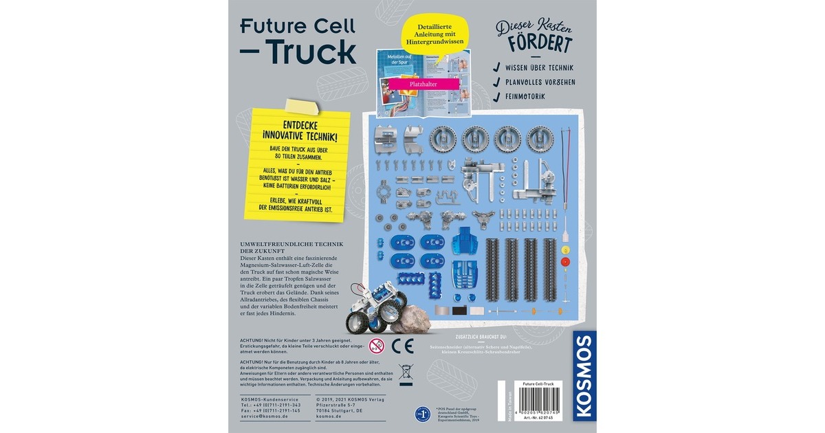 Mit ein paar Tropfen Wasser und Salz ein geländegängiges Fahrzeug antreiben? Na klar! Die Magnesium-Luft-Zelle macht es möglich! So kommt die Zukunfts-Technologie der Brennstoffzellen ins Kinderzimmer. Kinder von 8 bis 12 Jahren bauen den Truck nach der Anleitung zusammen und lernen dabei nicht nur, ein cooles Gefährt zu konstruieren – sie erleben auch, mit wie man ein Auto ganz emissionsfrei antreiben kann. Mit seinem Allrad-Antrieb und dem flexiblen Fahrgestell ist das Fahrzeug für jedes Gelände geeignet und meistert jedes Hindernis – ganz ohne Batterie. Wie Brennstoffzellen funktionieren? Das erklärt die spannend aufbereitete Anleitung. Mit dem Experimentierkasten von KOSMOS Technik spielerisch erleben – so geht Lernen heute!Art.-Nr.: 1732693