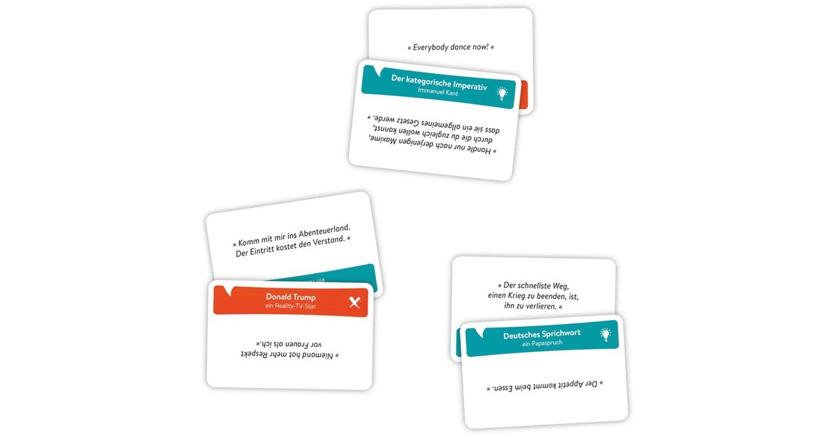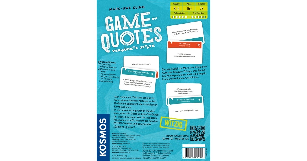 Jeder wählt ein Zitat – bekannt aus Marc-Uwe Klings Känguru-Büchern – und schiebt es einem falschen Autor unter. In fünf abwechslungsreichen Runden mit steigendem Schwierigkeitsgrad kann jeder seine Kreativität beim Verrücken der Zitate beweisen. Wer sich lustige Kombinationen ausdenkt, wird von den anderen nicht nur mit Gelächter, sondern auch mit WITZIG-Stempeln belohnt und gewinnt dadurch vielleicht das Spiel.Art.-Nr.: 1336477