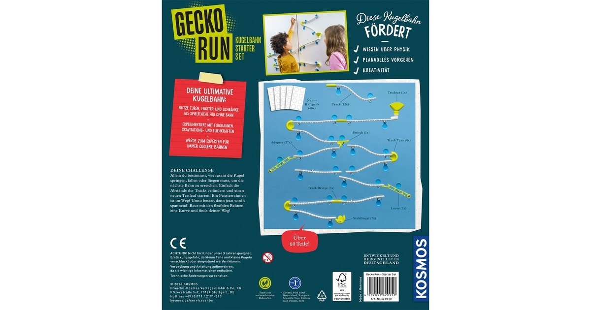 Rasante Kurven, clevere Hebel, biegsame Tracks: Diese innovative Kugelbahn von Kosmos ist ein tolles Erlebnis für Kugelbahn-Fans bei jedem Aufbau ein absolutes Unikat. Mit den rückstandsfreien haftenden Nano-Pads kann die Bahn ganz individuell an senkrechten, glatten Oberflächen befestigt und in Sekundenschnelle umgesetzt und feinjustiert werden. Ob über Hindernisse hinweg, ob an Türen, Glasscheiben, Fliesen oder Regalen - so gut wie alles ist möglich. Die Kinder entscheiden selbst, wie herausfordernd ihre Gecko Run-Strecke wird und wie experimentell sie mit freiem Fall und Schwerkraft umgehen. Mit diesem Starter-Set beginnt der Kugelbahn-Spaß, der durch separat erhältliche Erweiterungen flexibel zu gestalten ist.Art.-Nr.: 1904890