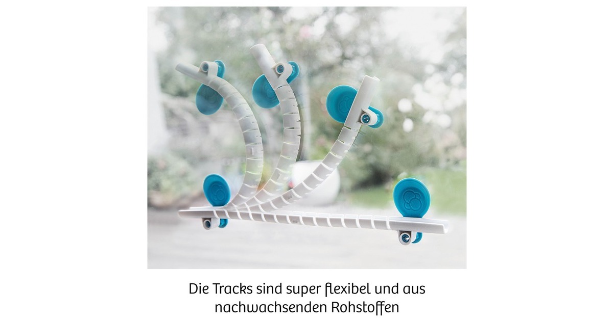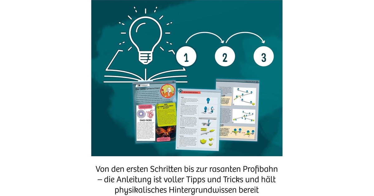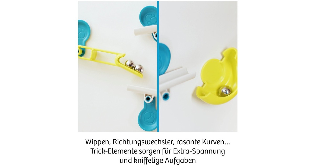 27 Adapter, 12 Bahnen, 2 Lever, 4 Track Turns, 3 Track Bridges, 1 Switch, 1 Trichter, 7 Stahlkugeln, 40 Nano-Haftpads, farbig illustrierte Anleitung |