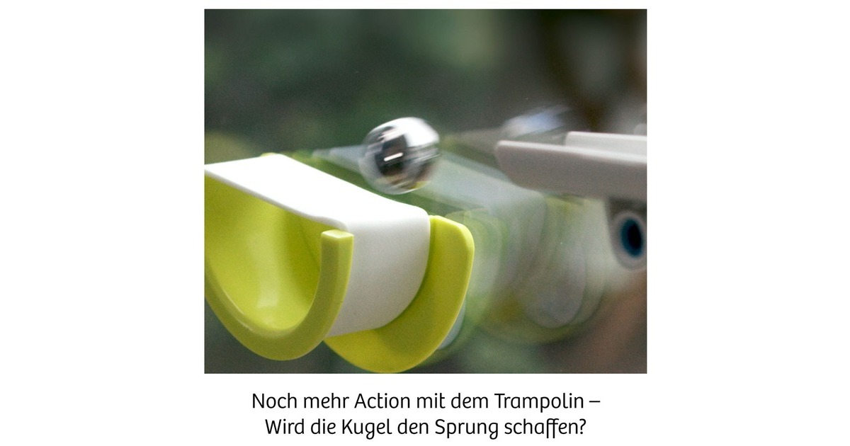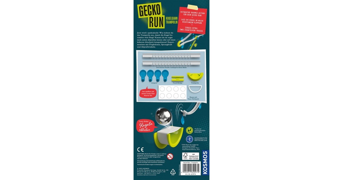 Mit dem Trampolin wird die Gecko Run-Kugelbahn um ein spektakuläres Element erweitert: Wie muss ich das Trampolin ausrichten, damit die Kugeln besonders weit oder hoch fliegen? Kann ich die Kugel sogar zurück auf einen höher liegenden Streckenabschnitt katapultieren? Spannende neue Fragen für Kugelbahn-Baumeister ab 8 Jahren. Die Anleitung gibt den ersten Kick mit tollen Ideen für die Tricks. Art.-Nr.: 1904891