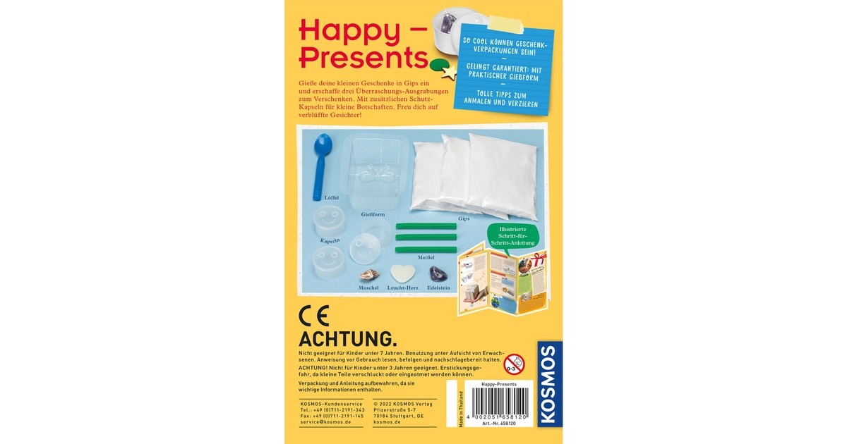 Mit "Happy Presents" von Kosmos bekommen kleine Geschenke jetzt eine außergewöhnliche und selbst gemachte Verpackung: Dieses Gipsguss-Set ermöglich Geschenke in selbst gegossenen Umhüllungen, die der Beschenkte dann selbst ausgraben kann. Gips anmischen, in die Gießform füllen und Geschenk mittendrin platzieren - dabei bleiben in der Sicherheitskapsel auch kleine Botschaften gut geschützt. Mit dem beiliegenden Amethysten oder dem nachtleuchtenden Herz bieten sich weitere kreative Möglichkeiten. Es können bis zu drei Gips-Blöcke hergestellt und nach dem Trocknen verziert werden. Art.-Nr.: 1877995