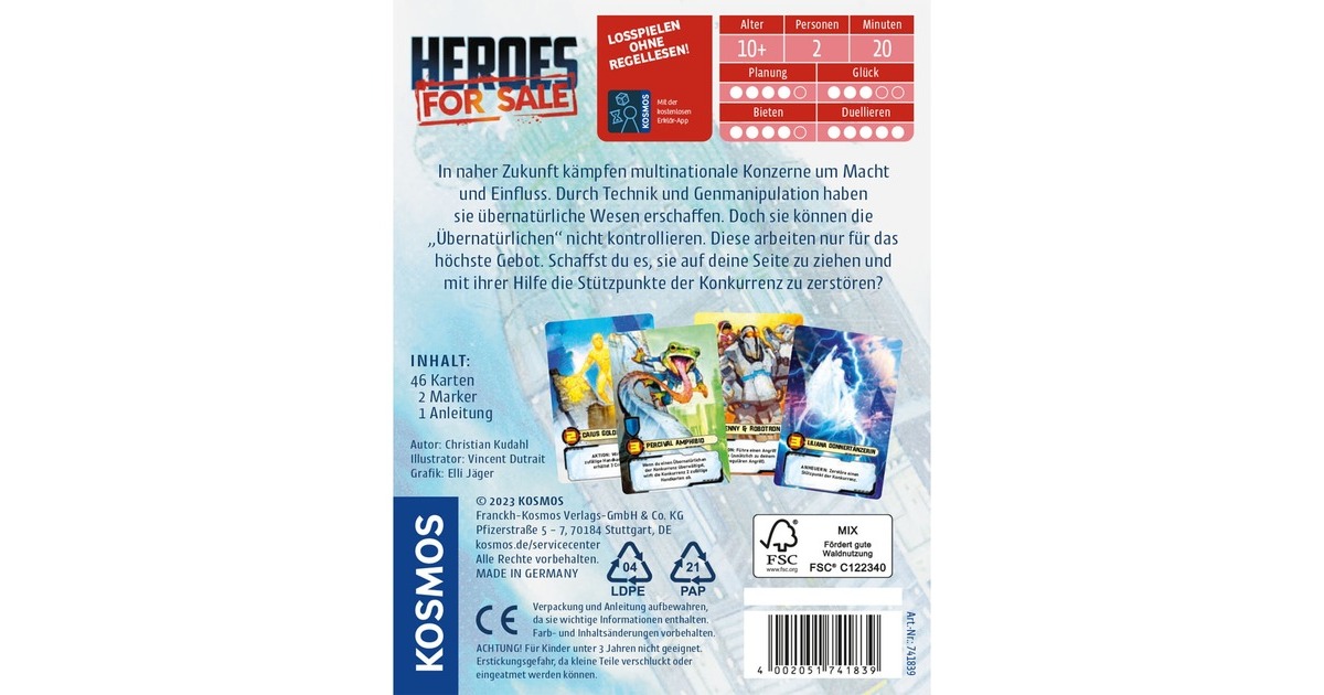 Dieses Kartenspiel entführt zwei Spieler oder Spielerinnen ab 8 Jahren in das Jahr 2077. Riesige Konzerne bestimmen das Geschehen auf der Welt. Dabei geht es vor allem um Geld - auch Credit genannt. Die Spieler bringen in jeder Runde verschiedene Superhelden-Karten ins Spiel. Wer am meisten bietet erhält die Helden und kann nun versuchen, die Stützpunkte des Gegners zu übernehmen. Dieses Trading Card-Spiel ist leicht zu lernen und jederzeit spannend.