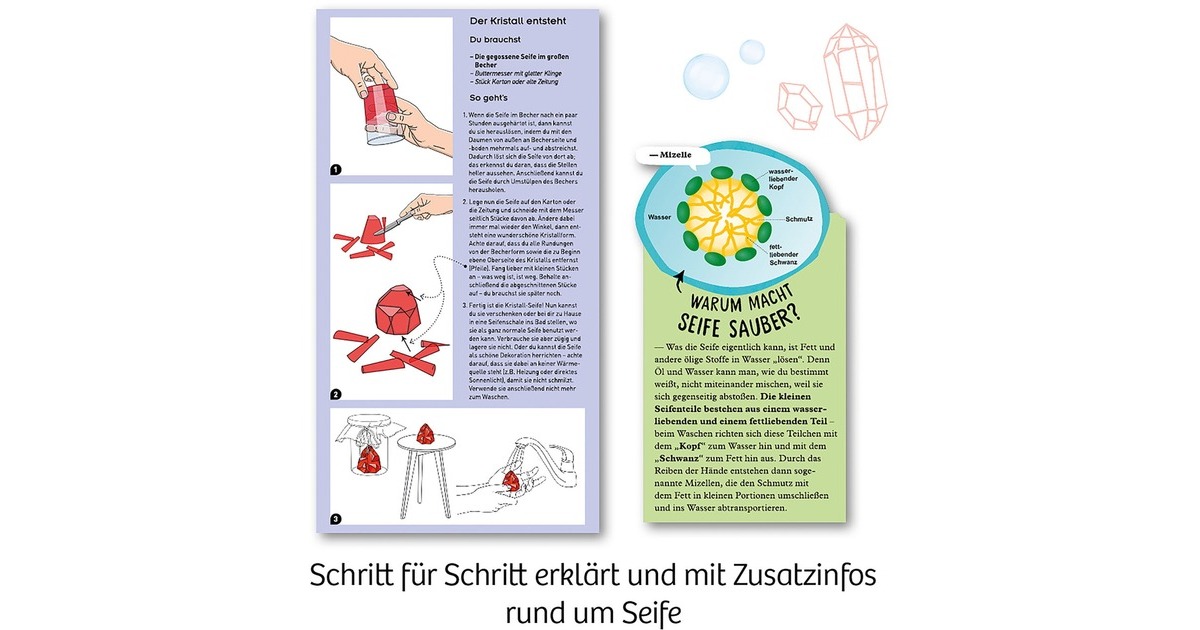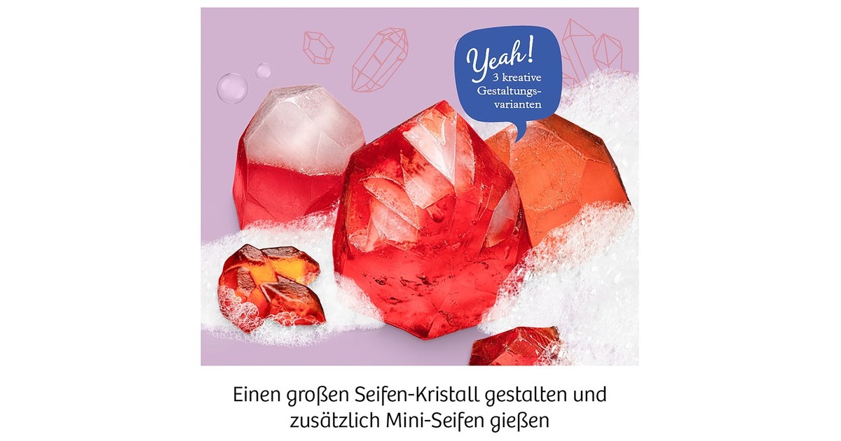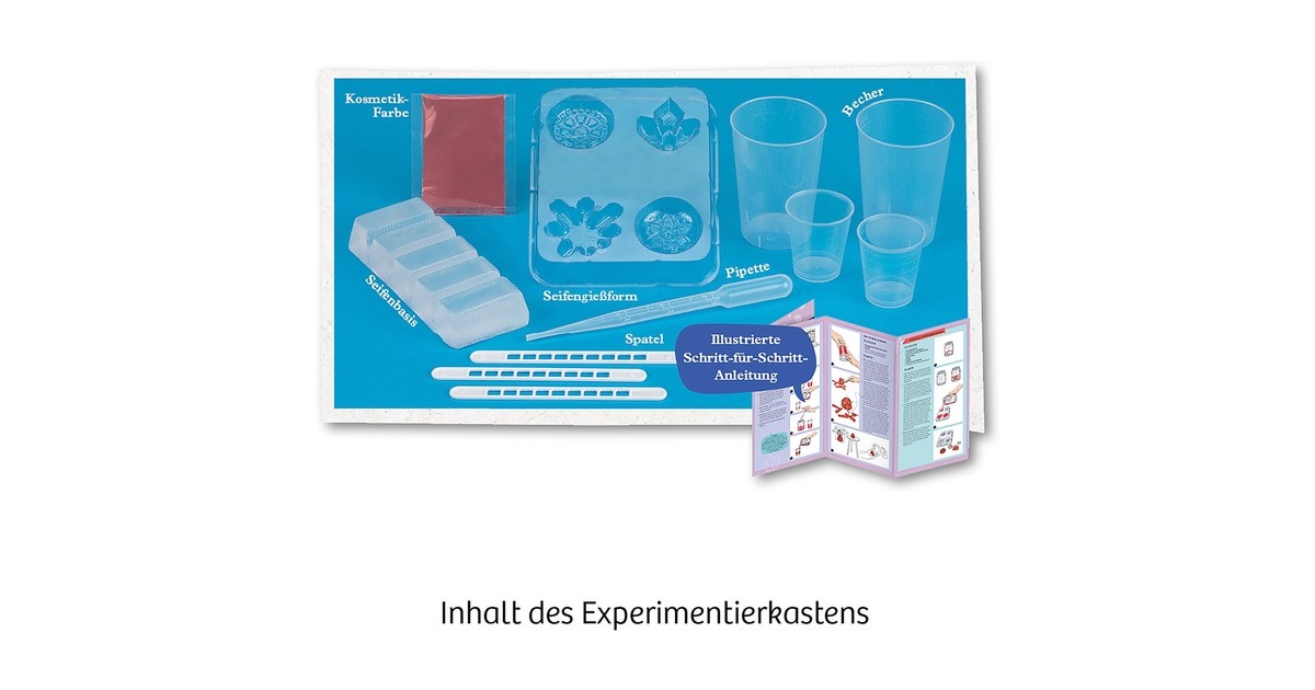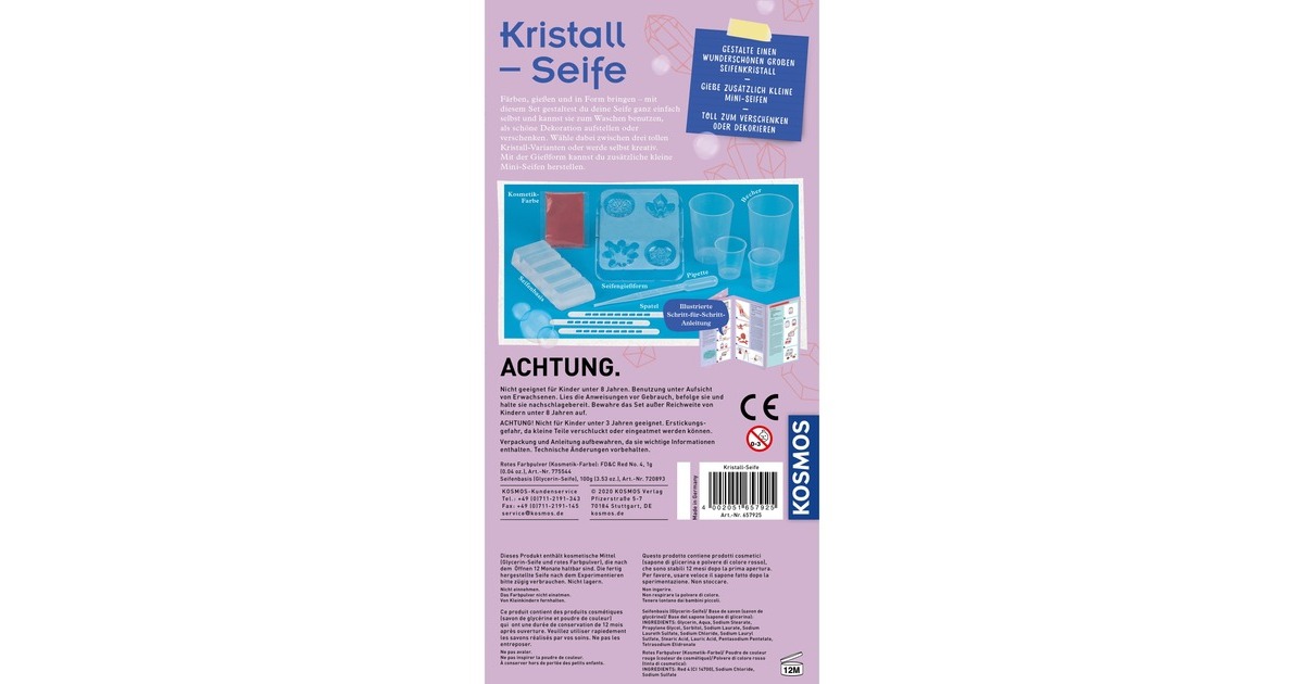 Färben, gießen und in Form bringen – mit diesem Experimentier-Set von KOSMOS gestalten Kinder von 8 bis 12 Jahren ihre eigene Seife ganz einfach selbst und können sie zum Waschen benutzen, als schöne Dekoration aufstellen oder verschenken. Für den großen Seifenkristall stehen drei tolle Kristall-Varianten zur Auswahl, aber natürlich dürfen die Kinder auch selbst kreativ werden. Tolles Extra: Mit der Gießform können zusätzlich ganz einfach kleine Mini-Seifen hergestellt werden.Art.-Nr.: 1618840