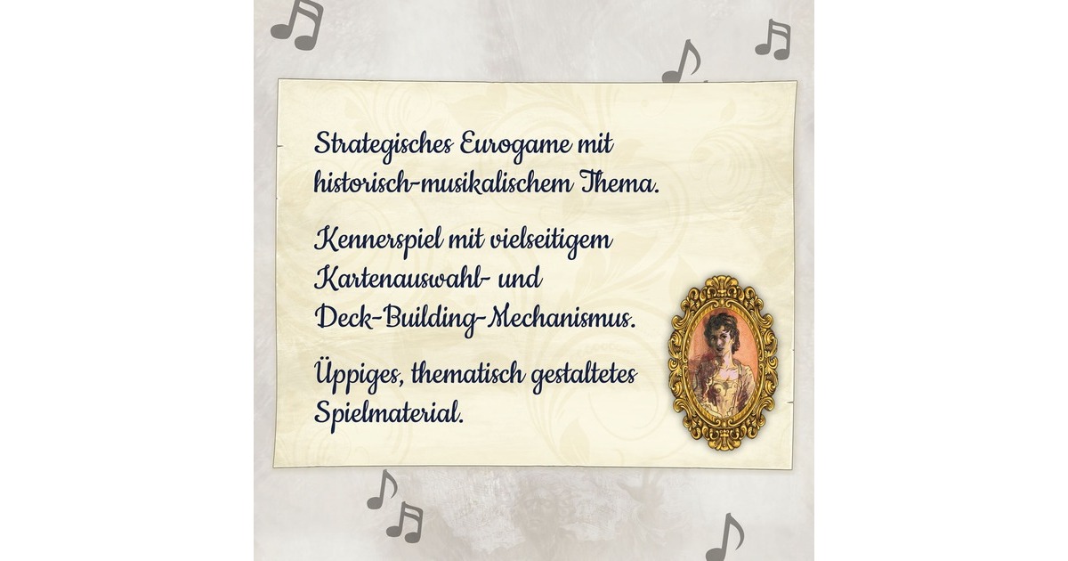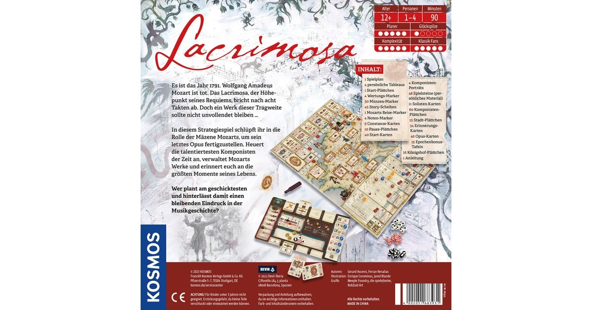 "Lacrimosa" spielt im Jahre 1791: Wolfgang Amadeus Mozart ist tot, womit auch sein letztes Werk unvollendet bleibt. Ein bis vier Spieler schlüpfen in die Rolle eines Mäzens, dessen Ziel es ist, das letzte Werk zu vollenden. Dafür suchen sie nach den begabtesten Komponisten, verwalten Mozarts Werke und beschäftigen sich mit den Höhepunkten seine Schaffens. "Lacrimosa" ist ein stimmungsvolles Kennerspiel mit musikalisch-historischem Hintergrund und prächtiger Ausstattung.Art.-Nr.: 100022277