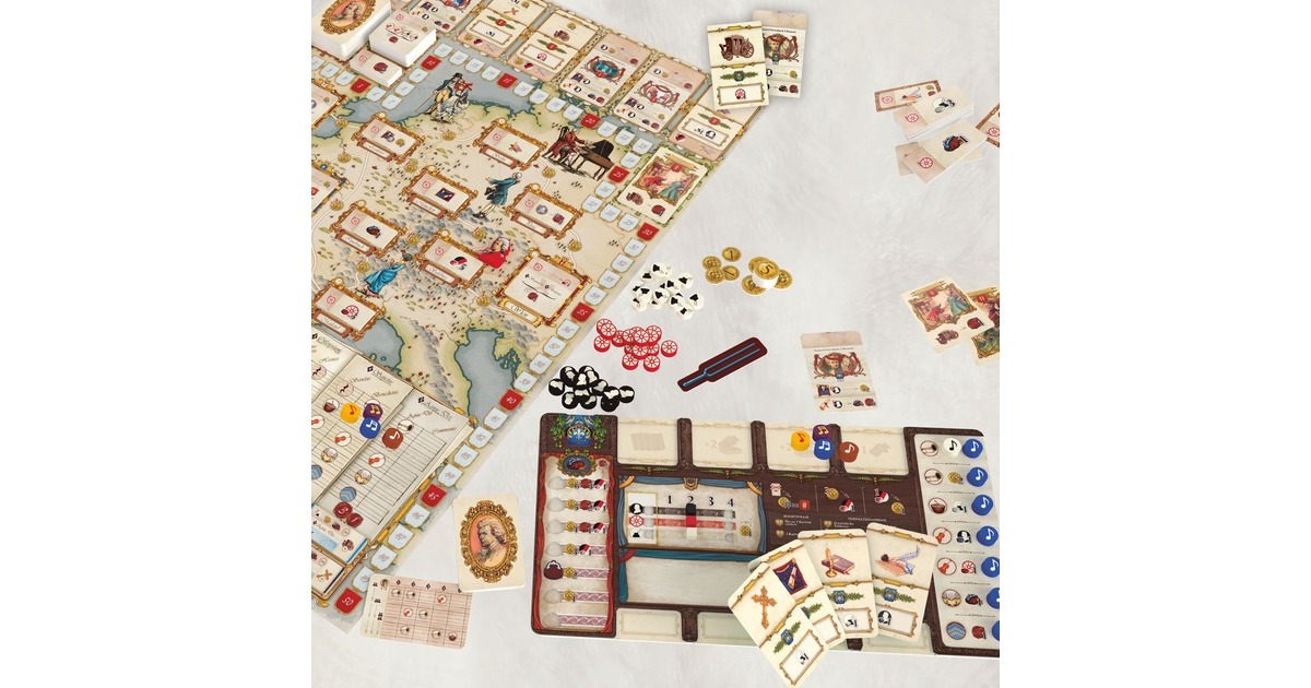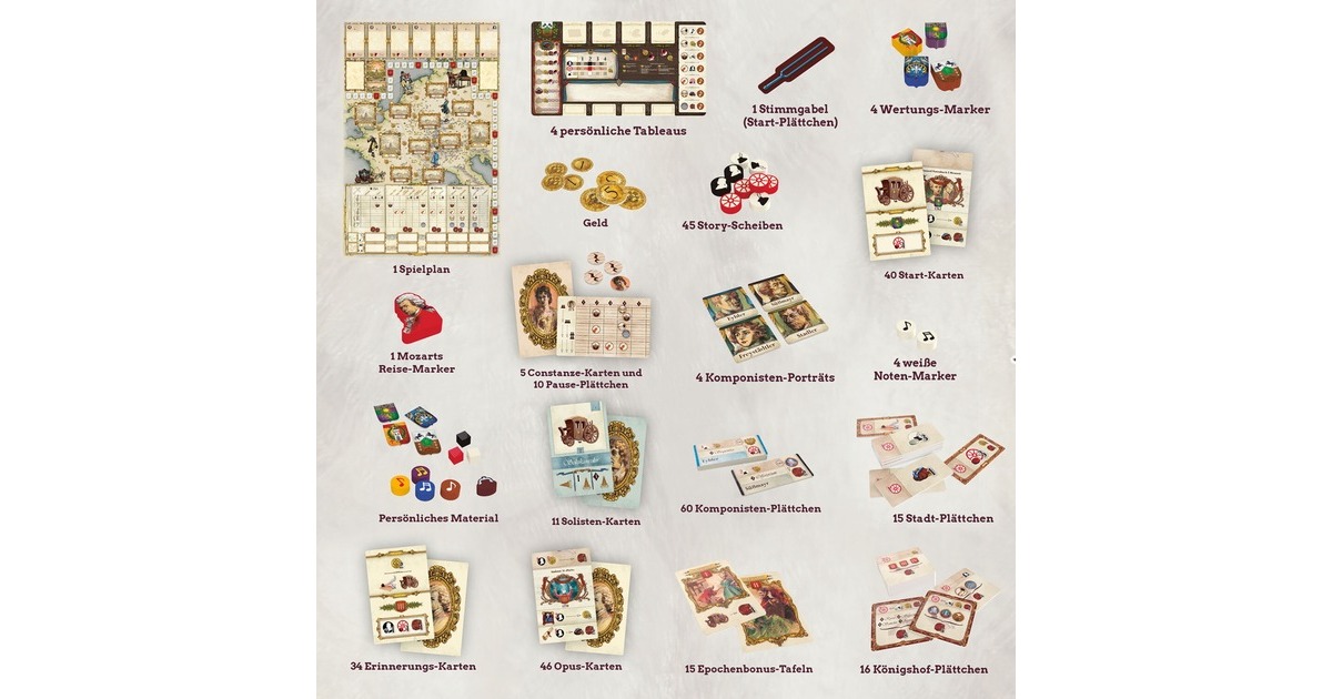 Spielplan, 4 persönliche Tableaus, 1 Start-Plättchen, 4 Wertungs-Marker, 30 Münzen-Marker, 45 Story-Scheiben, 1 Mozarts-Reise-Marker, 4 Noten-Marker, 5 Constanze-Karten, 10 Pause-Plättchen, 40 Start-Karten, 4 Komponisten-Porträts, 48 Spielsteine (persönliches Material), 11 Solisten-Karten, 60 Komponisten- Plättchen, 15 Stadt-Plättchen, 34 Erinnerungs-Karten, 46 Opus-Karten, 15 Epochenbonus-Tafeln, 16 Königshof-Plättchen, Anleitung |